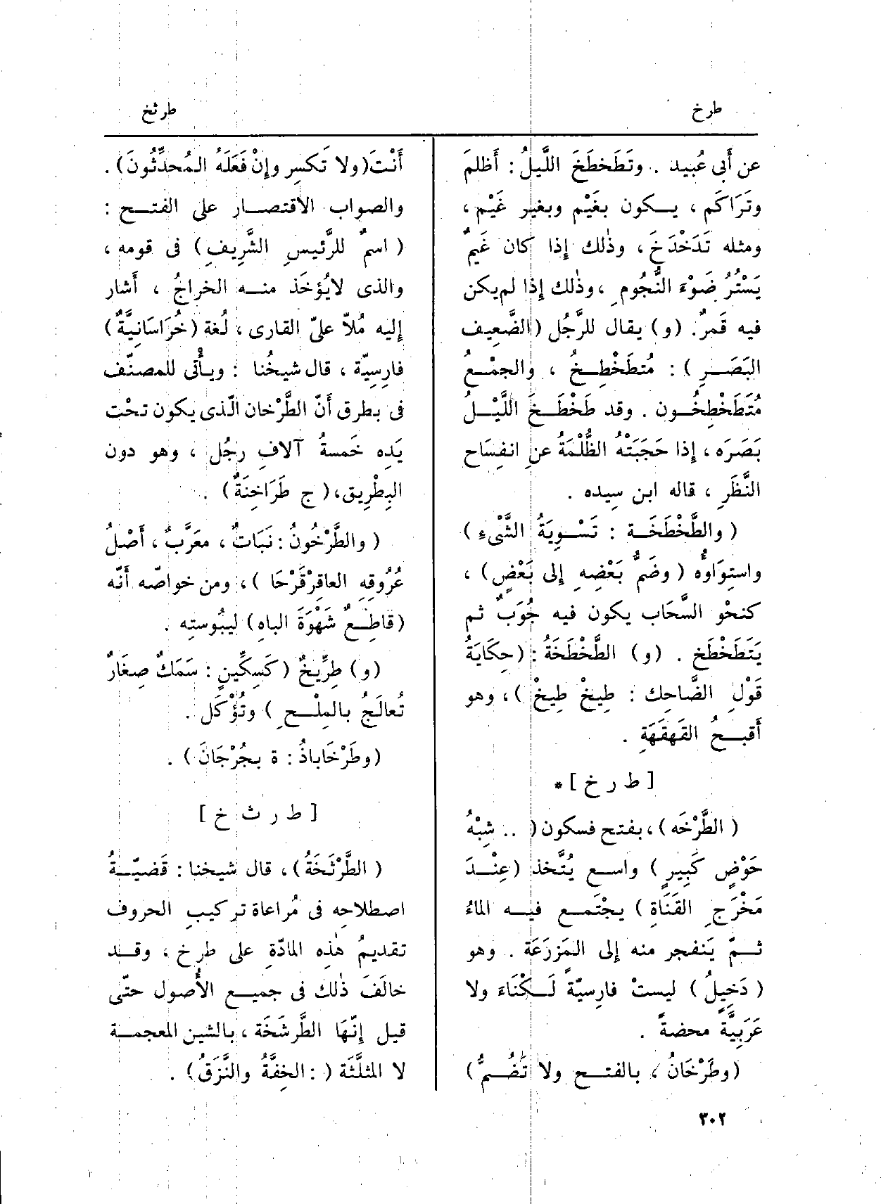 (وطَرْخَانُ، بِالْفَتْح وَلَا تَضُمُّ أَنْتَ (وَلَا تَكسِر وإِنْ فَعَلَهُ المُحدِّثُونَ) . وَالصَّوَاب الِاقْتِصَار على الْفَتْح: (اسمٌ للرَّئيسِ الشَّرِيفِ) فِي قومه، وَالَّذِي لَا يُؤخَذ مِنْهُ الخراجُ، أَشار إِليه مُلاّ عليّ الْقَارِي، لُغة (خُرَاسَانِيَّةٌ) فارِسِيّة، قَالَ شيخُنا: ويأْتي للمصنّف فِي بطرق أَنّ الطَّرْخان الّذي يكون تحْت يَدِه خَمسةُ آلافِ رجل، وَهُوَ دون البِطْرِيق، (ج طَرَاخِنَةٌ) .