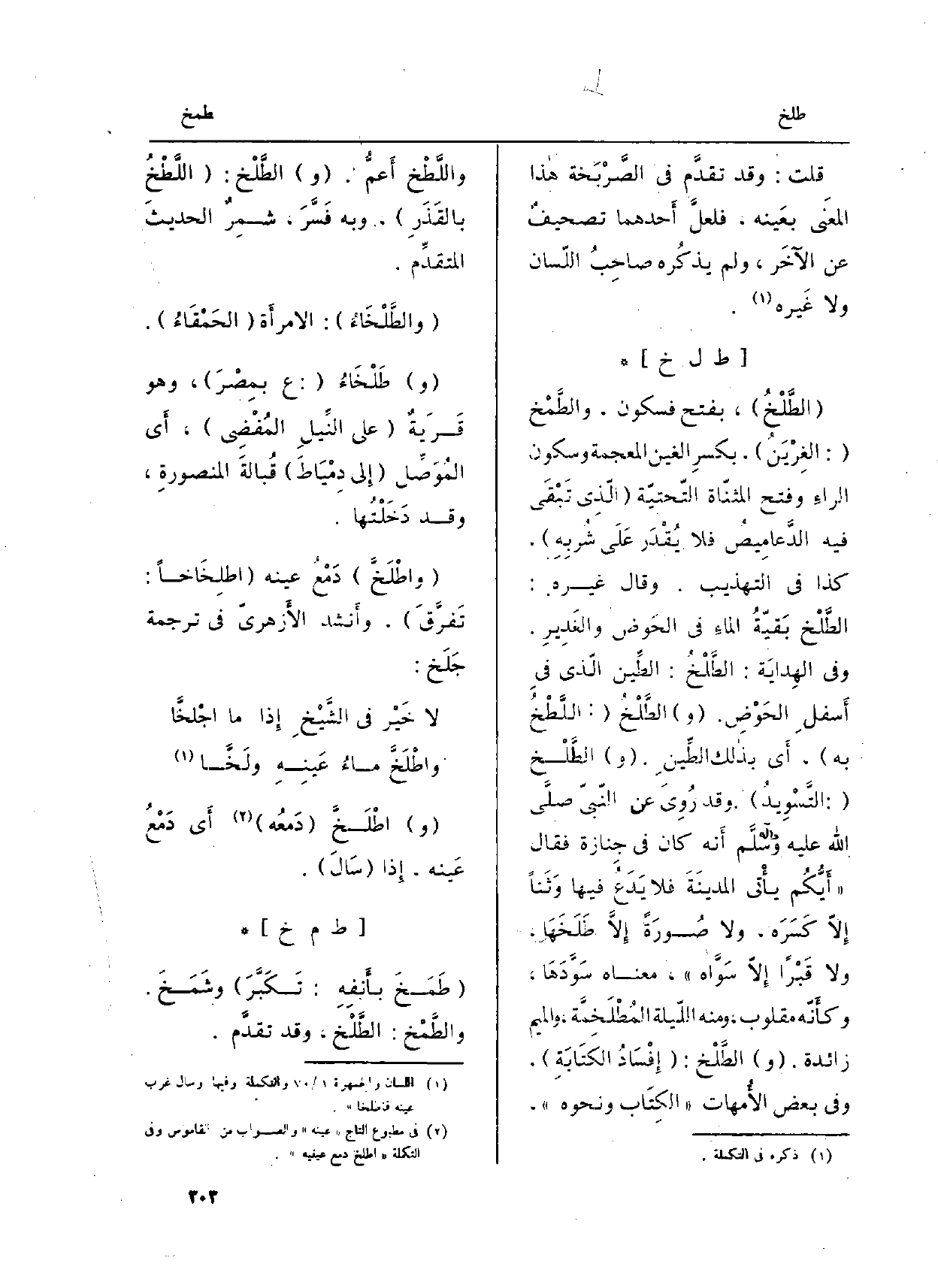 : (الطَّلْخُ) ، بِفَتْح فَسُكُون، والطَّمخ (: الغِرْيَنُ) ، بكسرِ الْغَيْن الْمُعْجَمَة وَسُكُون الراءِ وَفتح المثنّاة التّحتيّة (الّذِي تَبْقَى فِيهِ الدَّعامِيصُ فَلَا يُقْدَر عَلَى شُربِهِ) ، كَذَا فِي (التَّهْذِيب) . وَقَالَ غَيره: الطَّلْخ بَقيّةُ الماءُ فِي الحَوض والغَدِيرِ. وَفِي (الهِدَايَة) : الطَّلْخُ: الطِّين الّذي فِي أَسفلِ الحَوْضِ. (و) الطَّلْخُ (: اللَّطْخُ بِهِ) ، أَي بذالك الطِّينِ. (و) الطَّلْخ (: التَّسْوِيدُ) . وَقد رُوِيَ عَن النّبيّ صلى الله عَلَيْهِ وسلمأَنه كَانَ فِي جِنازة فَقَالَ: (أَيُّكُم يأْتي المدينَةَ فَلَا يَدَعُ فِيهَا وَثَناً إِلاّ كَسَرَه، وَلَا صُورَةً إِلاَّ طَلَخَهَا، وَلَا قَبْراً إِلاّ سَوَّاه) ، مَعْنَاهُ سَوَّدَهَا، وكأَنّه مقلوب، وَمِنْه اللَّيلة المُطْلَخِمَّة، وَالْمِيم زَائِدَة. (و) الطَّلْخ: (إِفْسَادُ الكتَابَةِ) ، وَفِي بعض الأُمهات (الكِتَاب وَنَحْوه) ، واللَّطْخ أَعمُّ. (و) الطَّلْخ: (اللَّطْخُ بالقَذَرِ) ، وَبِه فَسَّرَ، شمِرٌ الحديثَ المتقدِّم.