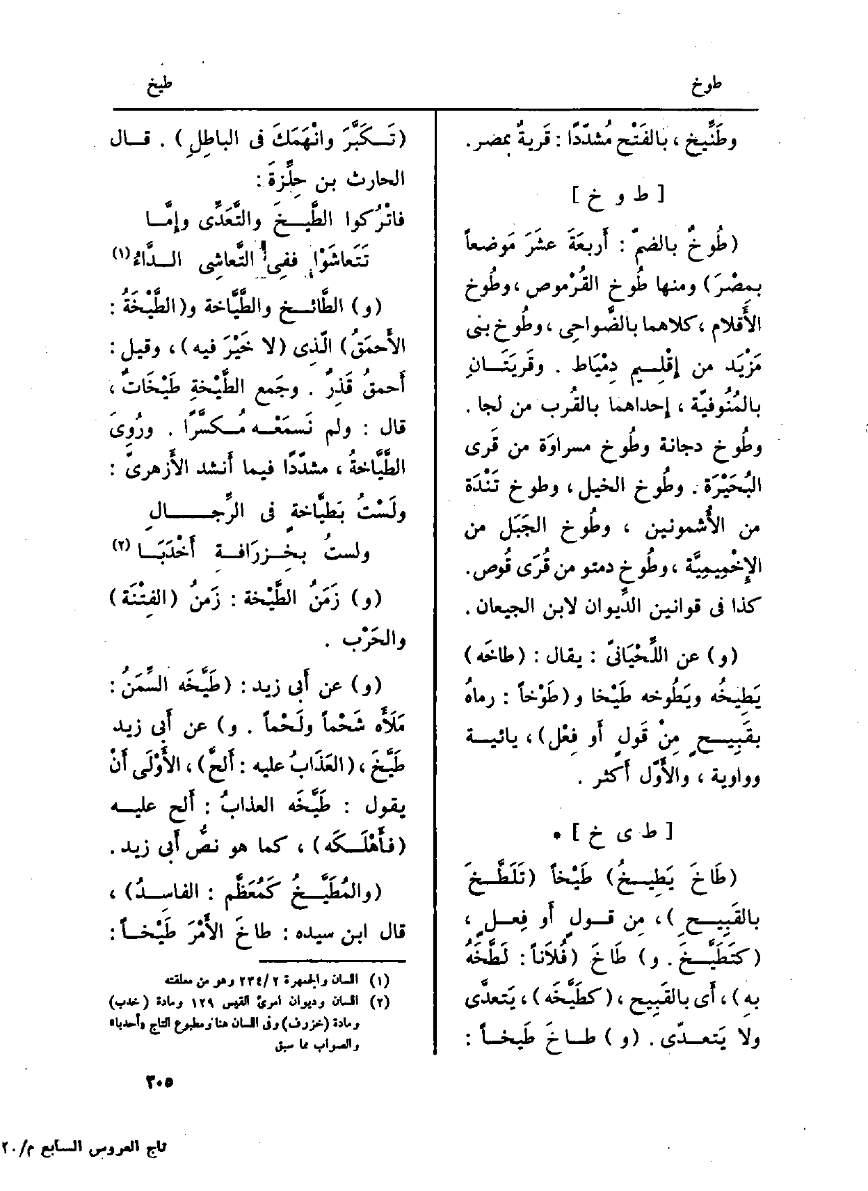 : (} طَاخَ {يَطِيخُ) } طَيْخاً (تَلَطَّخَ بالقَبِيحِ) ، مِن قولٍ أَو فِعلٍ، ( {كتَطَيَّخَ. و) طَاخَ (فُلاَناً: لَطَّخَهُ بهِ) ، أَي بالقَبِيح، (} كطَيَّخه) ، يَتعدَّى وَلَا يَتعدّى. (و) طاخَ طَيخاً: (تَكَبَّرَ وانهَمَكَ فِي الباطِلِ) . قَالَ الْحَارِث بن حِلِّزةَ: