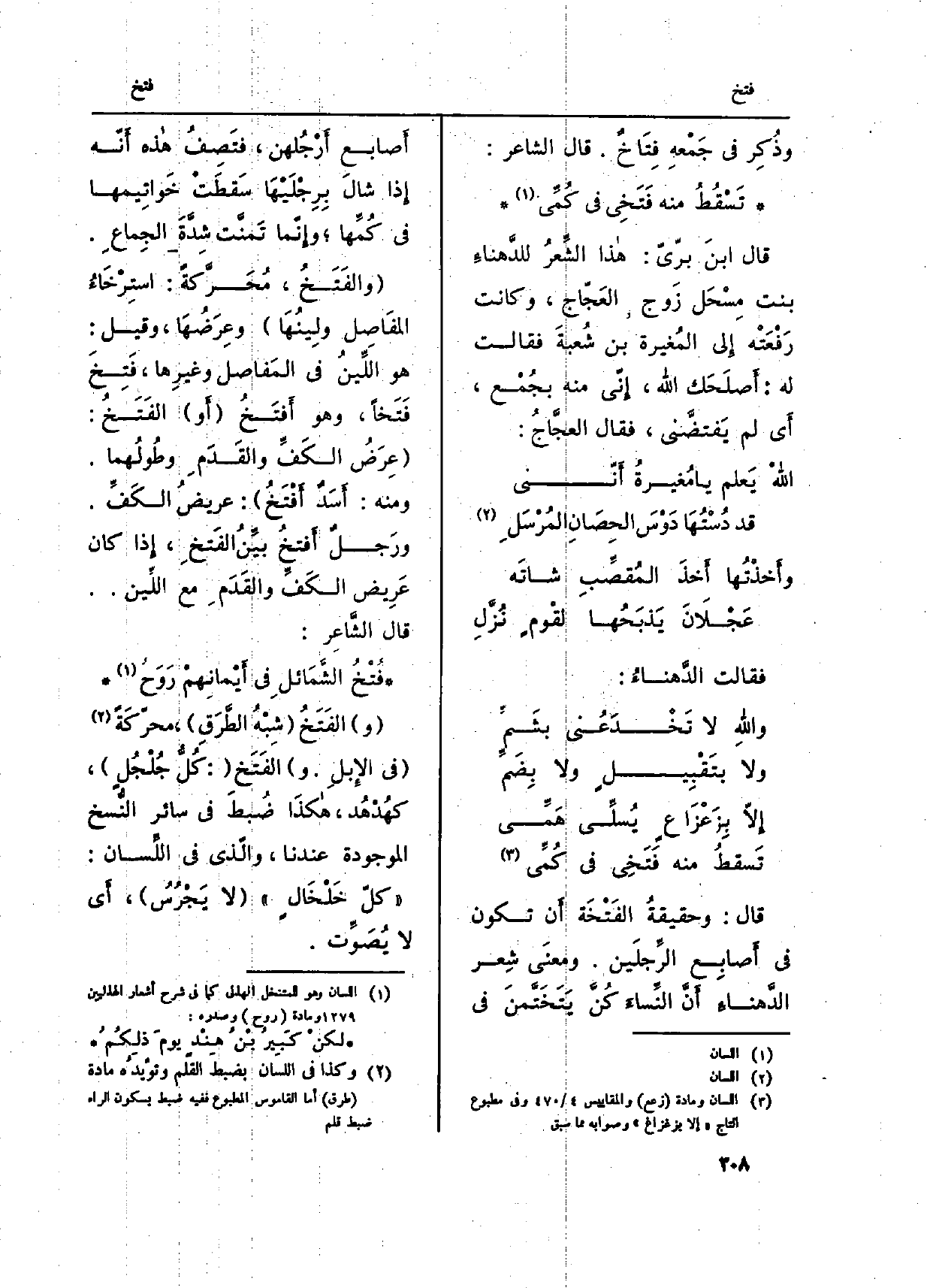 قَالَ: وحقيقةُ الفَتْخَة أَن تكون فِي أَصابِع الرَّجلَين. ومعنَى شِعر الدَّهناءِ أَنَّ النِّساءَ كُنَّ يَتَخَتَّمنَ فِي أَصابع أَرْجُلهن، فتَصِفُ هاذه أَنّه إِذا شالَ بِرِجْلَيْهَا سَقطَتْ خَواتِيمها فِي كُمِّها؛ وإِنّما تَمنَّت شِدَّةَ الجِماعِ.