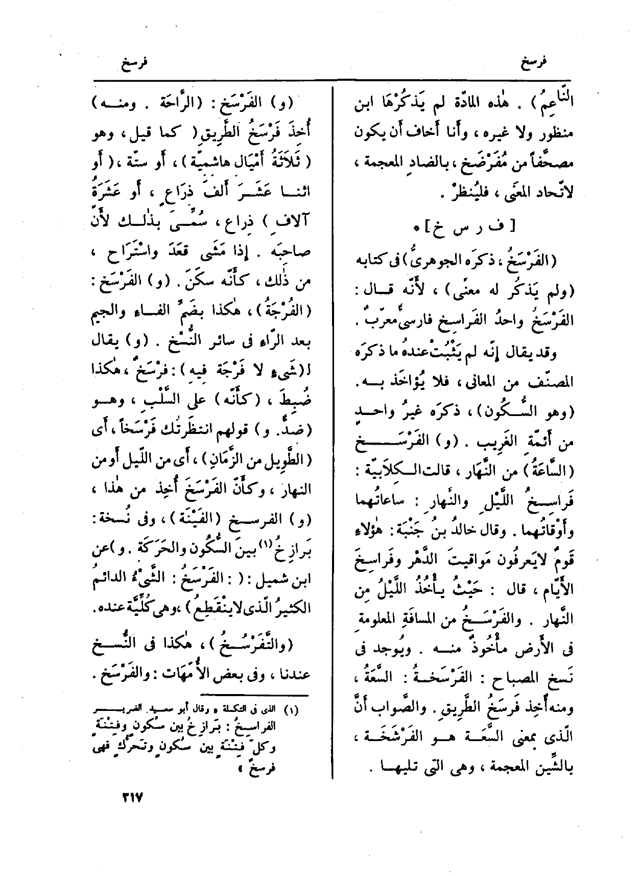 وَقد يُقَال إِنّه لم يَثْبُتّ عندهُ مَا ذكرَه المصنّف من الْمعَانِي، فَلَا يُؤاخَذ بِهِ. (وَهُوَ السُّكُون) ، ذكرَه غيرُ واحدٍ من أَئمّةِ الغَرِيب. (و) الفَرْسَخ (السَّاعَةُ) من النَّهَار، قَالَت الكِلاَبيّة: فَراسِخُ اللَّيْلِ والنَّهَارِ: ساعاتُهما وأَوْقاتُهما. وَقَالَ خالدُ بنُ جَنْبَة: هؤلاءِ قَوْمٌ لَا يَعرفُون مَواقيتَ الدَّهْر وفَرَاسِخَ الأَيّام، قَالَ: حَيْثُ يأْخُذُ اللَّيْلُ مِن النَّهار. والفَرْسَخُ من المسافَةِ المعلومةِ فِي الأَرض مأْخُوذٌ مِنْهُ. ويُوجد فِي نسخ (الْمِصْبَاح) : الفَرْسَخةُ: السَّعَةُ، وَمِنْه أُخِذ فَرسَخُ الطَّرِيقِ. والصَّواب أَنَّ الذَّي بِمَعْنى السَّعَة هُوَ الفَرْشَخَة، بالشِّين الْمُعْجَمَة، وَهِي الَّتِي تَلِيهَا.