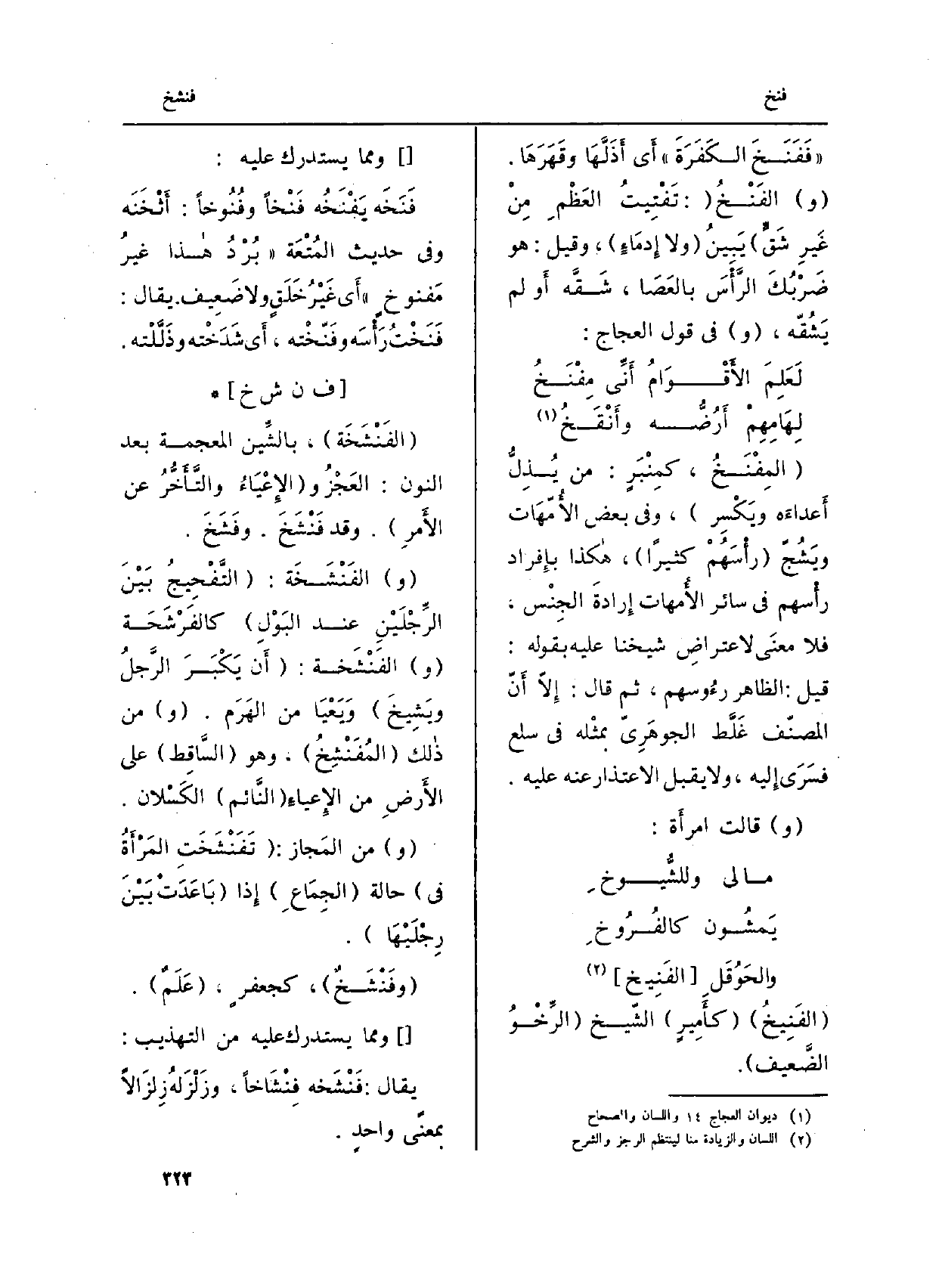 : (الفَنْشَخَة) ، بالشِّين الْمُعْجَمَة بعد النُّون: العَجْزُ و (الإِعْيَاءُ والتَّأَخُّرُ عَن الأَمرِ) . وَقد فَنْشَخَ. وفَشَخَ.
