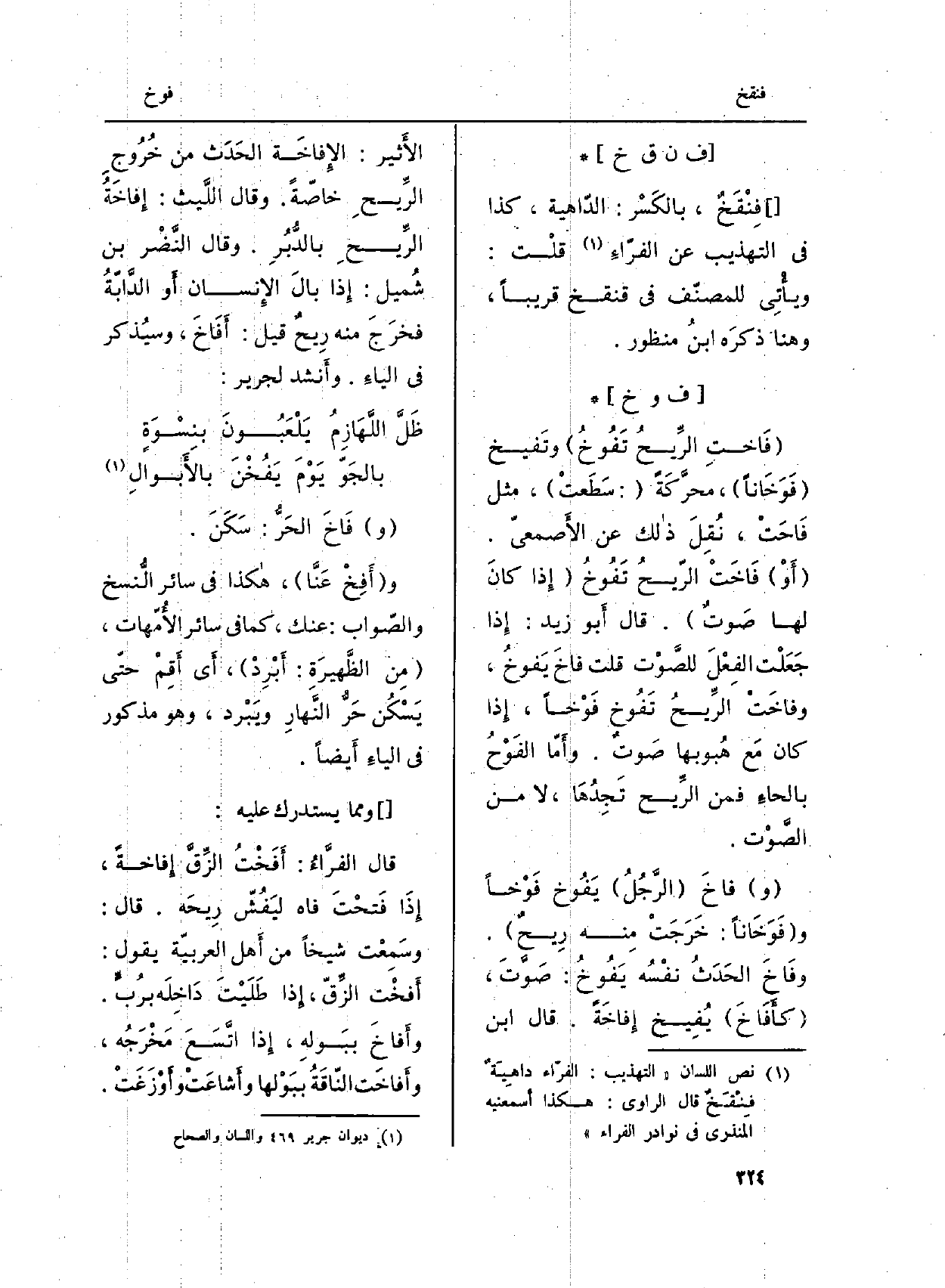 (و) } فاخَ (الرَّجُلُ) {يَفُوخ} فَوْخاً و (فَوَخَاناً: خَرَجَتْ مِنْه رِيحٌ) . {وفَاخَ الحَدَثُ نفْسُه} يَفُوخُ: صَوَّتَ، ( {كأَفَاخَ) } يُفِيخ {إِفاخَةً. قَالَ ابْن الأَثير:} الإِفاخَة الحَدَث من خُرُوجِ الرِّيحِ خاصّةً. وَقَالَ اللَّيث: إِفاخَةُ الرِّيحِ بالدُّبُرِ. وَقَالَ النَّضْر بن شُميل: إِذا بالَ الإِنسان أَو الدَّابّةُ فخرَجَ مِنْهُ رِيحٌ قيل: {أَفَاخَ، وسيُذكر فِي الياءِ. وأَنشد لجرير: