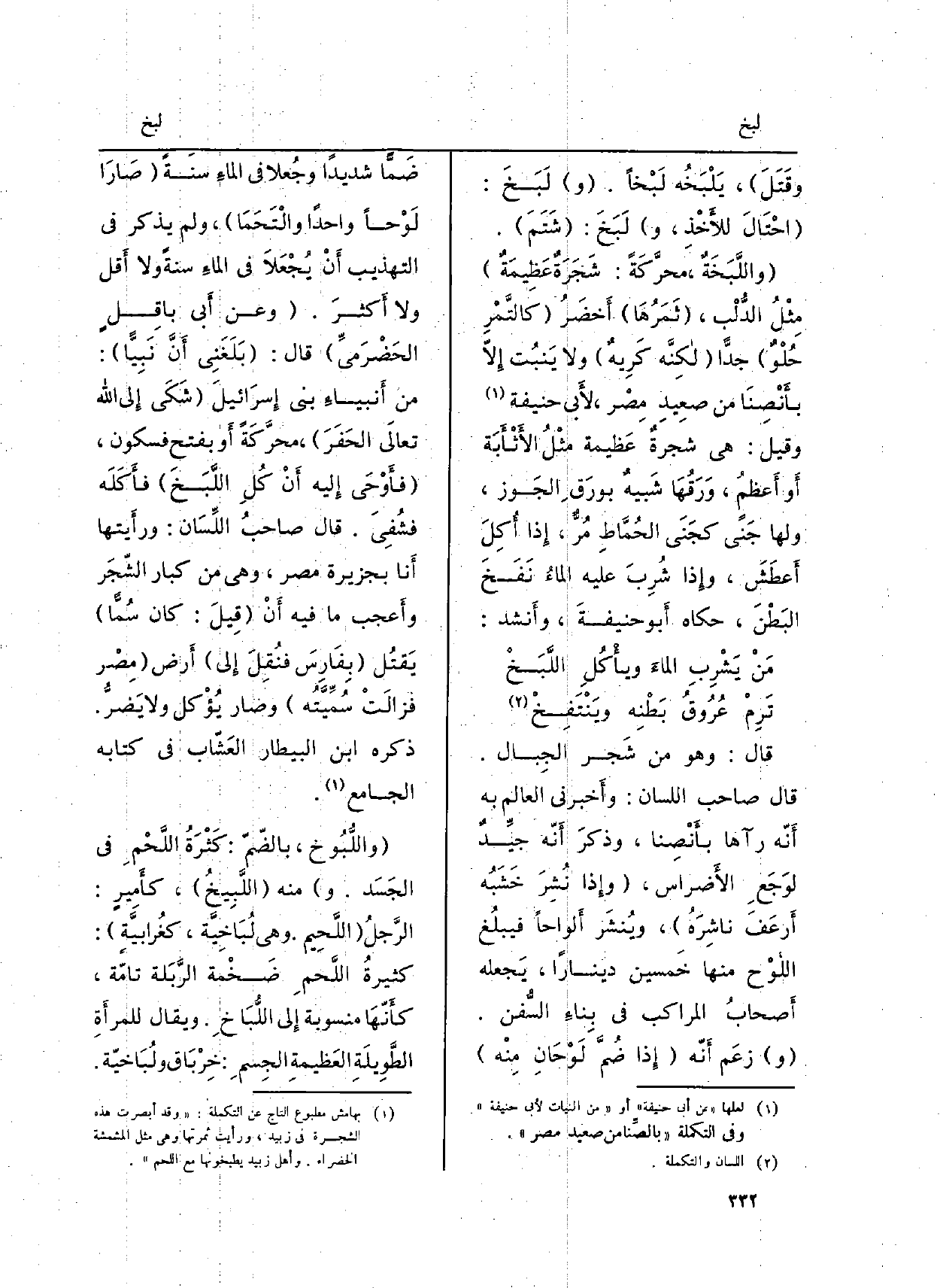 قَالَ: وَهُوَ من شَجر الجِبال. قَالَ صَاحب (اللِّسَان) : وأَخبرني الْعَالم بِهِ أَنّه رَآهَا بأَنْصِنا، وذكرَ أَنّه جيِّدٌ لوَجَعِ الأَضراس، (وإِذا نُشِرَ خَشَبُه أَرعَفَ ناشِرَهُ) ، ويُنشَر أَلواحاً فيبلُغ اللَّوْح مِنْهَا خَمسين دِينَارا، يَجعله أَصحابُ المراكب فِي بِناءِ السُّفن. (و) زعَم أَنّه (إِذا ضُمَّ لَوْحَانِ مِنْه ضَمًّا شَدِيدا وجُعلا فِي الماءِ سَنَةً) (صَارَا لَوْحاً وَاحِدًا والْتَحَمَا) ، وَلم يذكر فِي (التَّهْذِيب) أَنْ يُجْعَلاَ فِي الماءِ سنة وَلَا أَقل وَلَا أَكثرَ. (وَعَن أَبي باقِلٍ الحَضْرَميِّ) قَالَ: (بَلَغَنِي أَنَّ نَبِيًّا) : من أَنبياءِ بني إِسرَائيلَ (شَكَى إِلى الله تعالَى الحَفَرَ) ، محرَّكَةً أَو بِفَتْح فَسُكُون، (فأَوْحَى إِليه أَنْ كُلِ اللَّبَخَ) فأَكَلَه فشُفِيَ. قَالَ صاحبِ (اللِّسَان) : ورأَيتها أَنا بِجَزِيرَة مصر، وَهِي من كبار الشّجَر وأَعجب مَا فِيهِ أَنْ (قِيلَ: كَانَ سُمًّا) يَقتُل (بِفَارِسَ فنُقِلَ إِلى) أَرض (مِصْر فزالَتْ سُمِّيَّتُه) وَصَارَ يُؤْكل وَلَا يَضرُّ. ذكره ابْن البيطار العَشّاب فِي كتاب (الْجَامِع) .