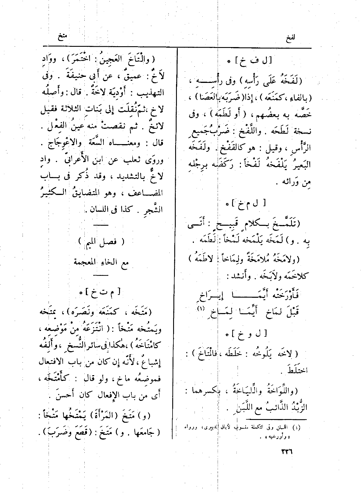 (} والْتَاخَ العَجِينُ: اخْتَمَرَ) ، ووَادٍ لاَخٌ: عميقٌ، عَن أَبي حنيفَةَ. وَفِي (التَّهْذِيب) : أَوْدِيَة! لاخَةٌ. قَالَ: وأَصلُه لاخ، ثمّ نُقِلَت إِلى بَناتِ الثَّلَاثَة فَقيل لائخٌ. ثمَّ نقصتْ مِنْهُ عينُ الفِعْل. قَالَ: وَمَعْنَاهُ السَّعَة والاعْوِجَاج. وروَى ثَعْلَب عَن ابْن الأَعرابيّ. وادٍ لاخٌّ بِالتَّشْدِيدِ، وَقد ذُكر فِي بَاب المضاعف، وَهُوَ المتضايقُ الكثيرُ الشَّجرِ. كَذَا فِي (اللِّسَان) .