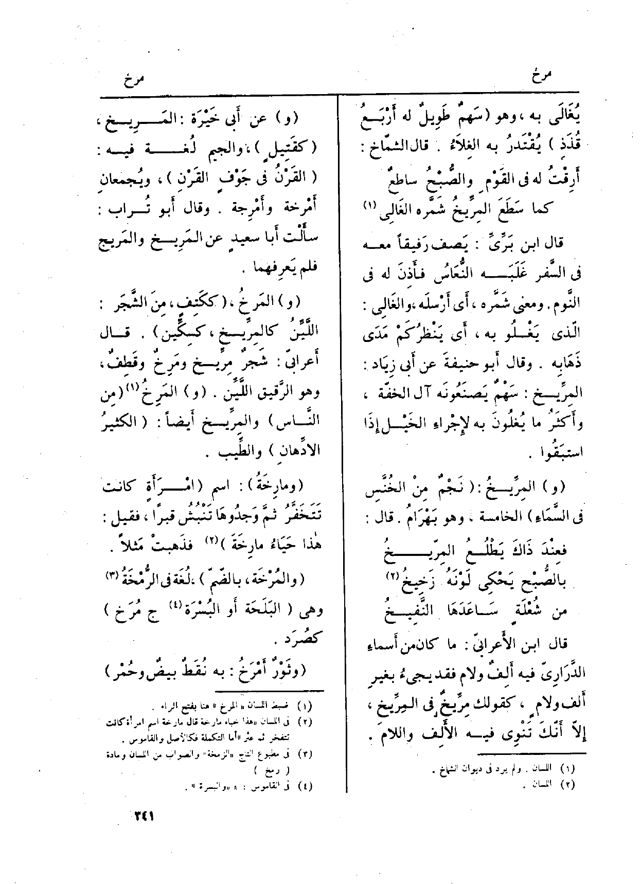 (و) المَرخُ، ككَتِفٍ، مِنَ الشَّجَر: اللَّيِّنُ كالمِرِّيخ، كسِكِّين) . قَالَ أَعرابيّ: شَجرٌ مِرِّيخ ومَرِخٌ وقَطِفٌ، وَهُوَ الرَّقيق اللَّيِّن. (و) المَرِخُ (مِن النَّاس) والمِرِّيخ أَيضاً: (الكثيرُ الادِّهانِ) والطِّيب.