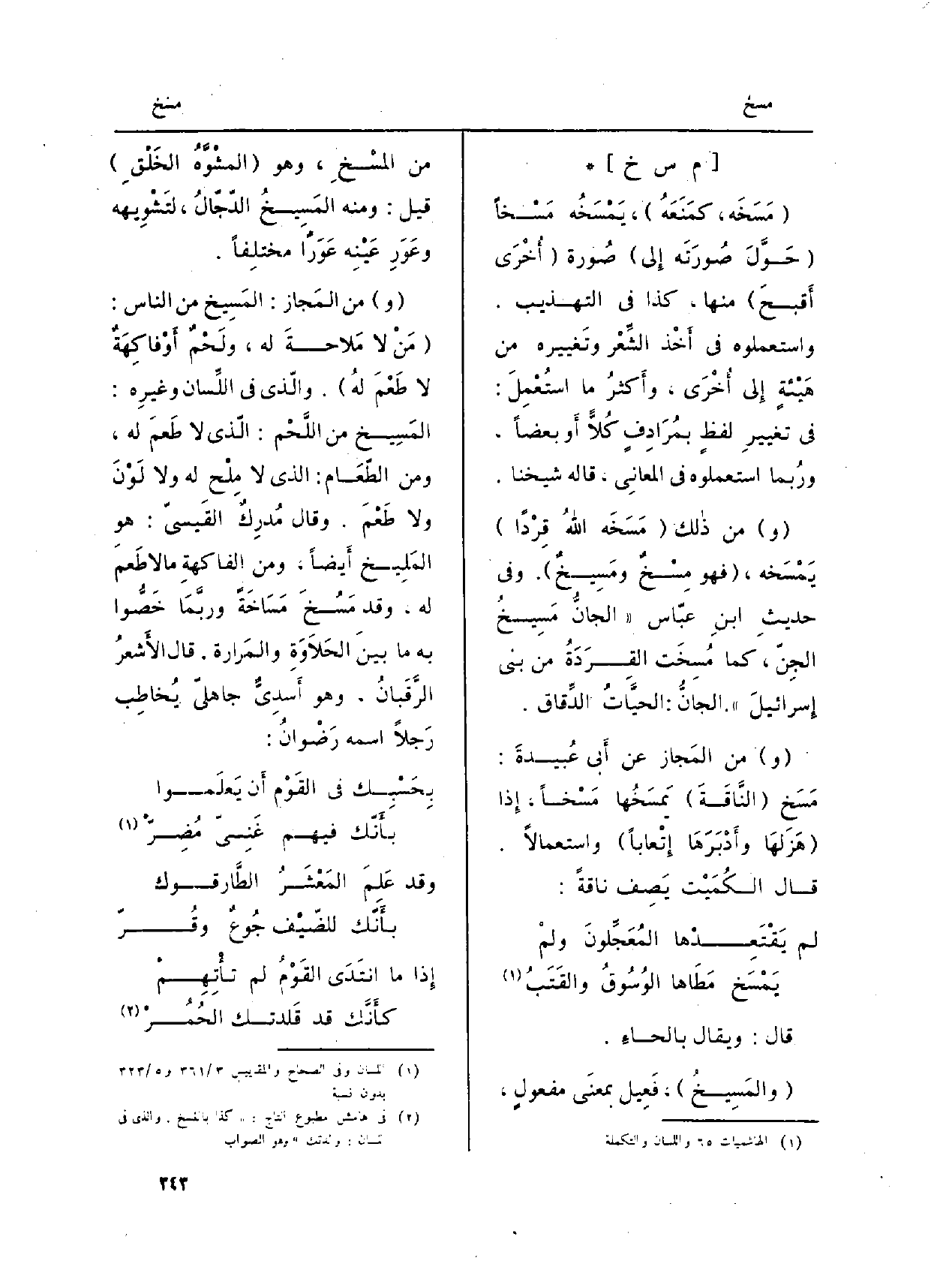 : (مَسَخَه، كمَنَعَهُ) ، يَمْسَخُه مَسْخاً (حَوَّلَ صُورَتَه إِلى) صُورة (أُخْرَى أَقبحَ) مِنْهَا، كَذَا فِي (التَّهْذِيب) . واستعملوه فِي أَخْذ الشِّعْر وتَغيير من هَيْئةٍ إِلى أُخْرَى، وأَكثرُ مَا استُعمِلَ: فِي تغييرِ لفظٍ بمُرَادِفٍ كُلاًّ أَو بَعْضًا، ورُبما استعملوه فِي المعانِي، قَالَه شَيخنَا.