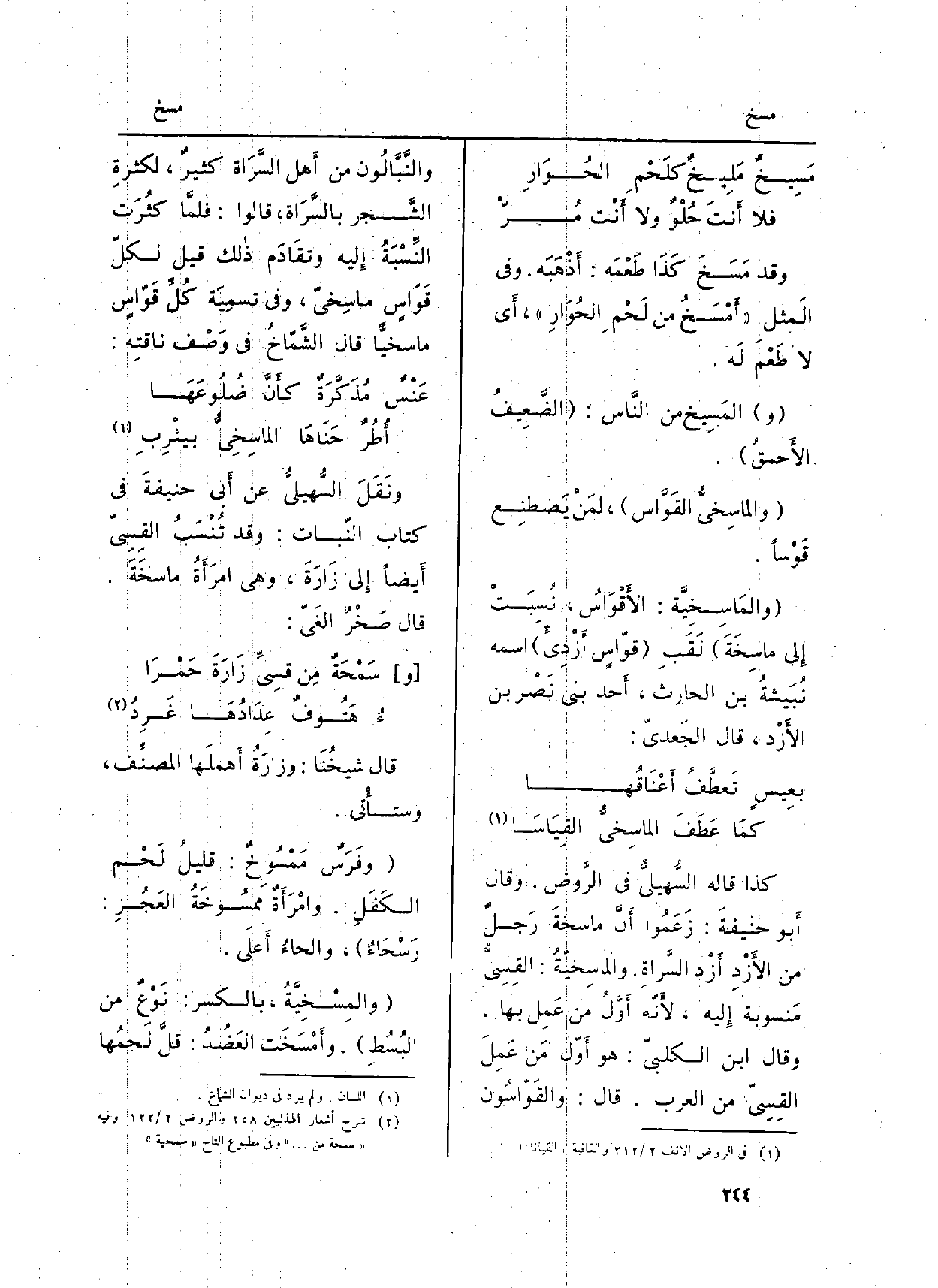 كَذَا قَالَ السُّهيليُّ فِي (الرَّوض) . وَقَالَ أَبو حنيفةَ: زَعَمُوا أَنَّ ماسخةَ رَجلٌ من الأَزْدِ أَزْد السَّراةِ. والماسِخيّةُ: القِسِيُّ مَنسوبة إِليه، لأَنّه أَوَّلُ من عَمِل بهَا. وَقَالَ ابْن الكلبيّ: هُوَ أَوّل مَن عَمِلَ القِسِيّ من الْعَرَب. قَالَ: والقَوّاسُون والنَّبَّالُون من أَهل السَّرَاة كثيرٌ، لكثرةِ الشَّكر بالسَّرَاة، قَالُوا: فلمَّا كثُرَت النِّسّبَةُ إِليه وتقَادَم ذالك قيل لكلّ قَوْاسٍ ماسِخيّ، وَفِي تسمِيَة كُلِّ قَوْاسٍ ماسخيًّا قَالَ الشَّمّاخُ فِي وَصْف ناقتِه: