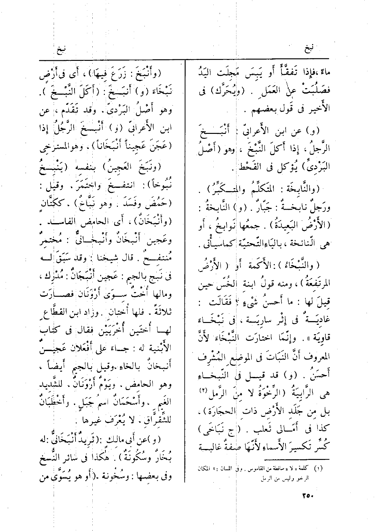 (والنَّبْخَاءُ) : الأَكَمة أَو (الأَرْضُ المرتَفِعَةُ) ، وَمِنْه قولُ ابنةُ الخُسّ حِين قيلَ لَهَا: مَا أَحسنُ شيْءٍ؟ فَقَالَت: غادِيَةٌ فِي إِثْر سارِيَة، فِي نَبْخَاءَ قاوِيَة) . وإِنّمَا اختارَت النَّبْخَاءَ لأَنَّ الْمَعْرُوف أَنَّ النَبَاتَ فِي الموضِعِ المُشْرِف أَحسَنُ. (و) قد قيل فِي النّبخاءِ هِيَ الرَّابِيَةُ (الرِّخْوَةُ لَا مِنَ الرَّمل بل مِن جَلَدِ الأَرْضِ ذاتِ الحجَارَة) ، كَذَا فِي أَمَالي ثَعلب. (ج نَبَاخَى) كُسِّر تَكسيرَ الأَسماءِ لأَنّهَا صفةٌ غالبة.
