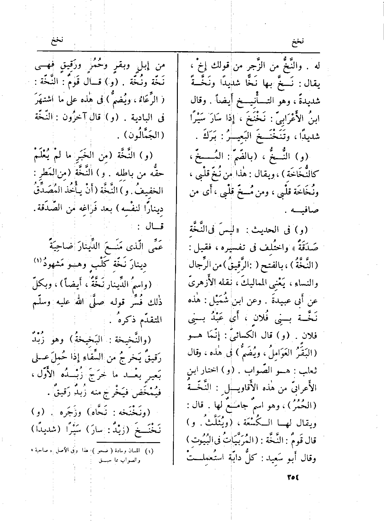 (و) فِي الحَدِيث: (ليسَ فِي النَّخَّةِ صَدَقَةٌ) واختُلِف فِي تَفْسِيره، فَقيل: (النَّخَّةُ) ، بِالْفَتْح (: الرَّقِيقُ) من الرِّجال والنساءِ، يَعْنِي المماليكَ، نَقله الأَزهريّ عَن أَبي عبيدةَ. وَعَن ابْن شُمَيْل: هاذه نَخَّة بنِي فُلانٍ، أَي عَبْدُ بنِي فلانٍ. (و) قَالَ الكسائيّ: إِنّمَا هُوَ (البَقَرُ العَوَامِلُ، ويُضَمُّ) فِي هاذه، وَقَالَ ثَعْلَب: هُوَ الصّواب. (و) اخْتَار ابْن الأَعرابيّ من هاذه الأَقاويلِ: النَّخّةُ (الحُمُرُ) ، وَهُوَ اسمٌ جامعٌ لَهَا. قَالَ: وَيُقَال لَهَا الكُسْعَة، (ويُثَلَّثُ. و) قَالَ قَومٌ: النَّخَّة: (المُرَبَّيَاتُ فِي البُيُوتِ) وَقَالَ أَبو سَعِيد: كلُّ دابّة استُعمِلتْ من إِبلٍ وبقرٍ وحُمُرٍ ورَقِيقٍ فَهِيَ نَخّة ونُخّة. (و) قَالَ قَوْمٌ: النَّخّة: (الرِّعَاءُ، ويُضمُّ) فِي هاذه على مَا اشتهَرَ فِي الْبَادِيَة. (و) قَالَ آخرُون: النّخّة (الجَمَّالُون) .
