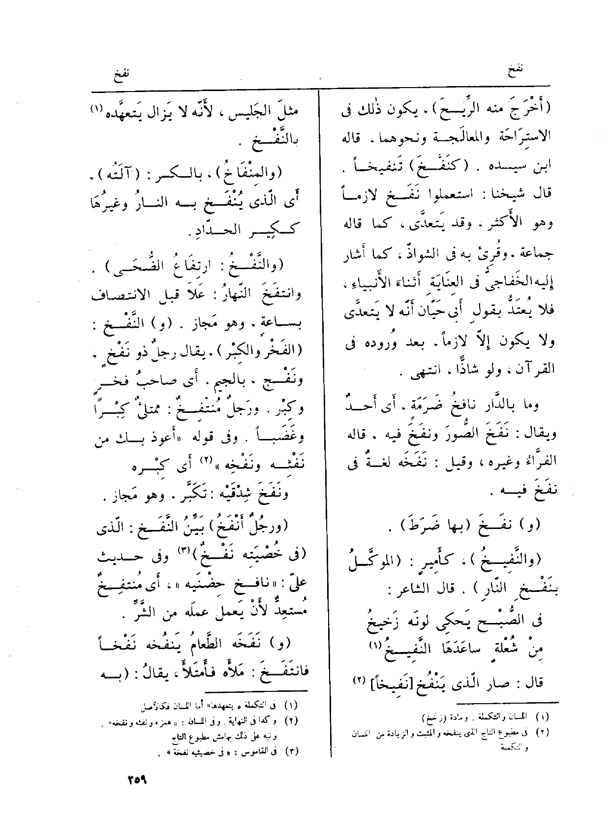(أَخْرَجَ مِنْهُ الرِّيحَ) ، يكون ذالك فِي الاستِرَاحَة والمعالَجة وَنَحْوهمَا، قَالَه ابْن سَيّده. (كنَفَّخَ) تَنفيخاً. قَالَ شَيخنَا: استعملوا نَفَخ لَازِما وَهُوَ الأَكثر، وَقد يَتعدَّى، كَمَا قَالَه جمَاعَة، وقُرِىء بِهِ فِي الشواذّ، كَمَا أَشار إِليه الخَفاجيُّ فِي العِنَايَةِ أَثناءَ الأَنبياءِ، فَلَا يُعتَدُّ بقولِ أَبي حَيّان أَنّه لَا يَتعدَّى وَلَا يكون إِلا لَازِما، بعد وُروده فِي الْقُرْآن، وَلَو شاذًّا، انْتهى.