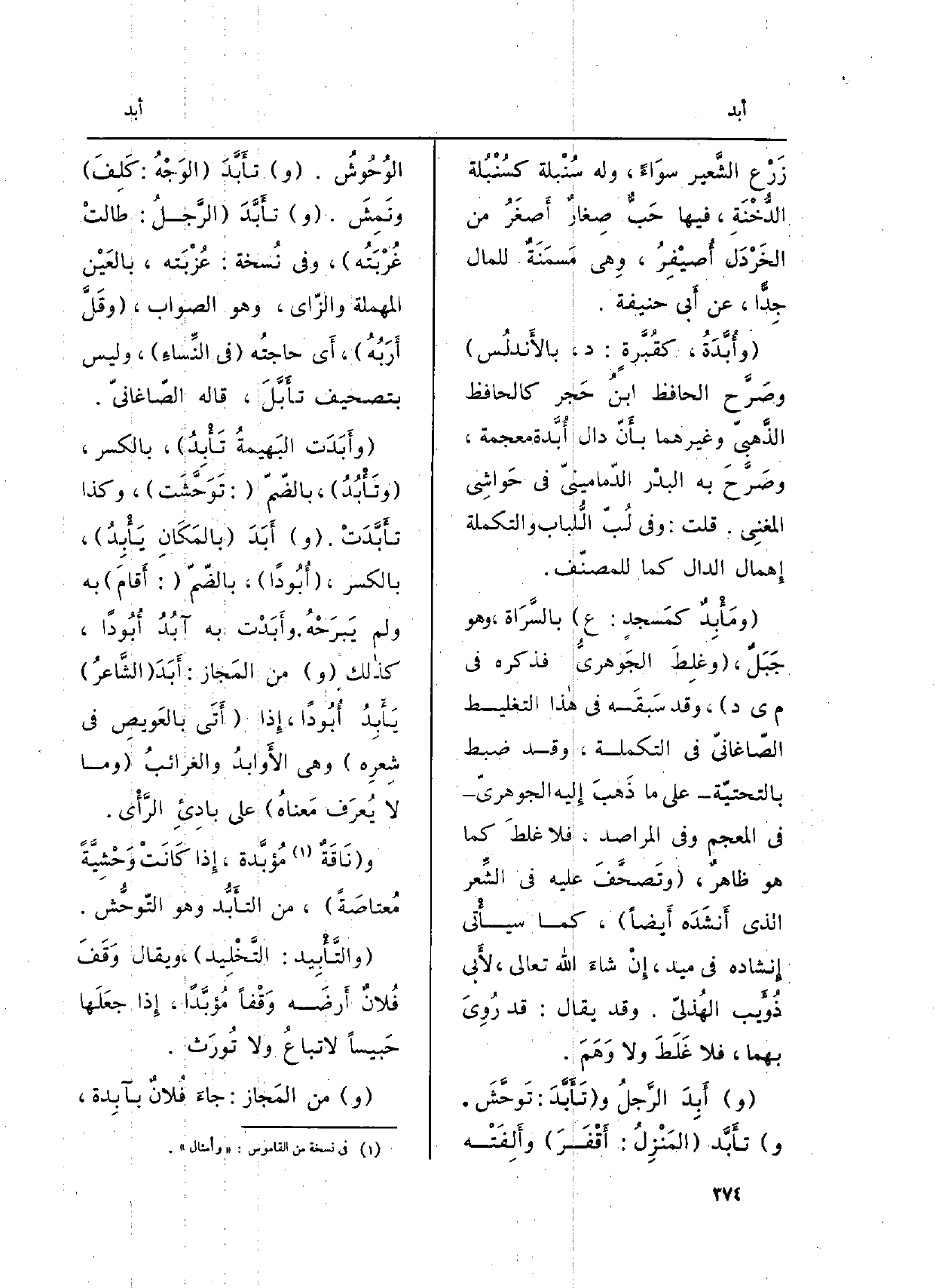 (} وأَبَدَت البَهيمةُ {تَأْبِدُ) ، بِالْكَسْرِ، (} وتَأْبُدُ) ، بالضّمّ (: تَوَحَّشَت) ، وَكَذَا {تأَبَّدَتْ. (و) } أَبَدَ (بالمَكَانِ {يَأْبِدُ) ، بِالْكَسْرِ، (} أُبُوداً) ، بالضّمّ (: أَقامَ) بِهِ وَلم يَبرَحْهُ. {وأَبَدْت بِهِ} آبُدُ {أُبُوداً، كَذَلِك (و) من المَجاز: أَبَدَ (الشَّاعرُ) يأْبِدُ أُبُوداً، إِذا (أَتَى بالعَويصِ فِي شِعرِه) وَهِي الأَوابدُ والغرائبُ (وَمَا لَا يُعرَف مَعناهُ) على بادِىءِ الرَّأَي.