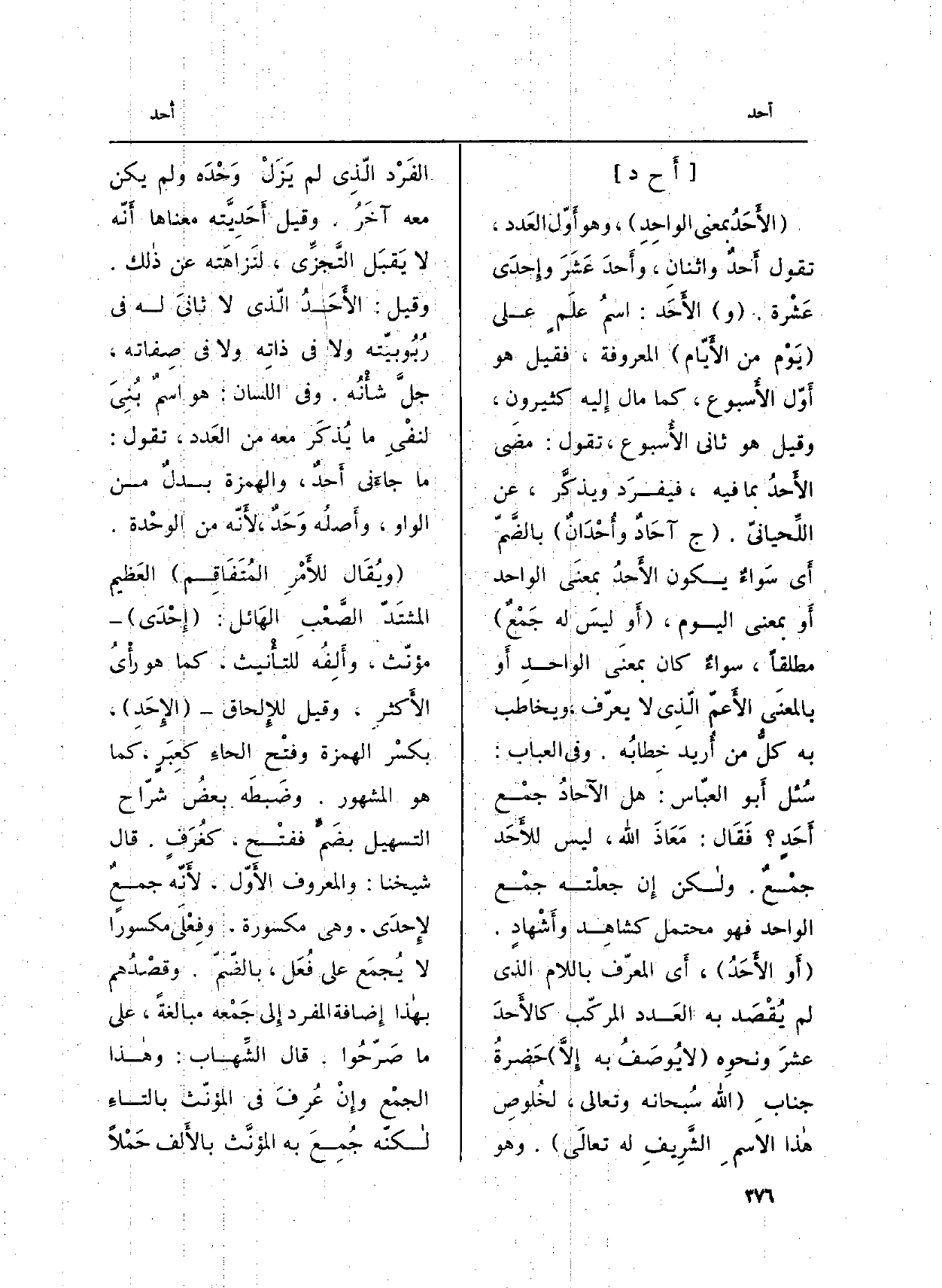 : ( {الأَحَدُ بِمَعْنى الواحِدِ) ، وَهُوَ أَوّل العَدد، تَقول} أَحدٌ واثنانِ، {وأَحدَ عَشَرَ وإِحدَى عَشْرة. (و) } الأَحَد: اسمُ علَمٍ على (يَوْم من الأَيّام) الْمَعْرُوفَة، فَقيل هُوَ أَوّل الأَسبوع، كَمَا مَال إِليه كَثِيرُونَ، وَقيل هُوَ ثَانِي الأُسبوع، تَقول: مضَى الأَحدُ بِمَا فِيهِ، فيفرَد ويذكَّر، عَن اللِّحيانيّ. (ج {آحَادٌ} وأُحْدَانٌ) بالضَّمّ أَي سَواءٌ يكون الأَحدُ بمعنَى الْوَاحِد أَو بِمَعْنى الْيَوْم، (أَو ليسَ لَهُ جَمْعٌ) مُطلقًا، سواءٌ كَانَ بمعنَى الواحدِ أَو بِالْمَعْنَى الأَعمّ الّذِي لَا يعرّف، ويخاطب بِهِ كلُّ من أُريد خِطابُه. وَفِي الْعباب: سُئل أَبو العبّاس: هَل {الآحادُ جمْع أَحَدٍ؟ فَقَال: مَعَاذَ الله، لَيْسَ} للأَحَد جمْعٌ. وَلَكِن إِن جعلْته جمْع الْوَاحِد فَهُوَ مُحْتَمل كشاهِد وأَشْهادٍ. (أَو الأَحَدُ) ، أَي المعرّف بِاللَّامِ الَّذِي لم يُقْصَد بِهِ العَدد المركّب كالأَحدَ عشرَ ونحوِه (لَا يُوصَفُ بِهِ إِلاَّ) حَضرةُ جنابِ (الله سُبحانه وَتَعَالَى، لخُلوص هاذا الاسمِ الشَّرِيفِ لَهُ تعالَى) . وَهُوَ الفَرْد الّذِي لم يَزَلْ وَحْدَه وَلم يكن مَعَه آخَرُ. وَقيل {أَحَدِيَّته مَعْنَاهَا أَنّه لَا يَقبَل التَّجزِّي، لنَزاهَته عَن ذالك. وَقيل: الأَحَدُ الّذي لَا ثانىَ لَهُ فِي رُبُوبيّته وَلَا فِي ذاتِه وَلَا فِي صِفاته، جلَّ شأْنُه. وَفِي (اللِّسَان) : هُوَ اسمٌ بُنِيَ لنفْيِ مَا يُذكَر مَعَه من العَدد، تَقول: مَا جاءَني أَحدٌ، والهمزة بدلٌ من الْوَاو، وأَصلُه وَحَدٌ، لأَنُّه من الوحْدة.