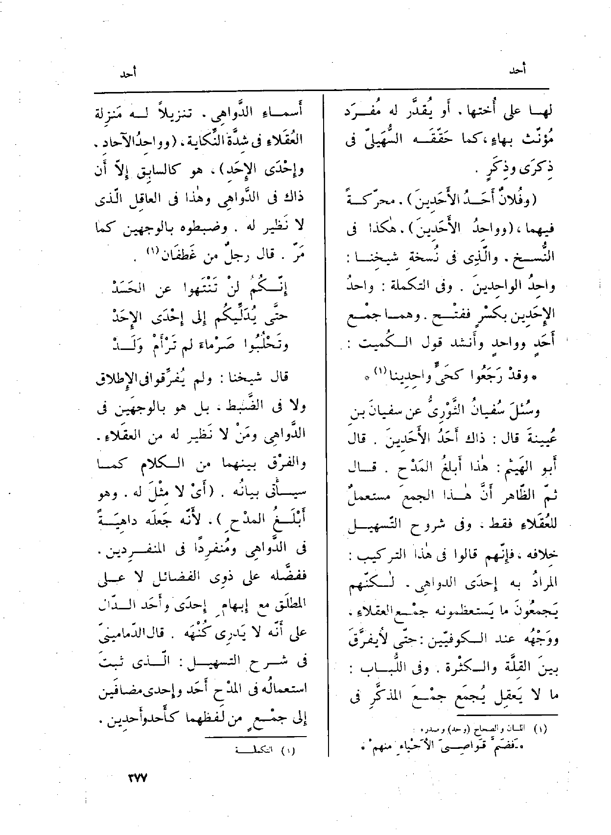 قَالَ شَيخنَا: وَلم يُفرِّقوا فِي الإِطلاق وَلَا فِي الضَّبط، بل هُوَ بالوجهَين فِي الدَّواهِي ومَنْ لَا نَظير لَهُ من العقَلاءِ، والفرْق بَينهمَا من الْكَلَام كَمَا سيأْتي بيانُه. (أَيْ لَا مِثْلَ لَهُ، وَهُوَ أَبْلَغُ المدْحِ) ، لأَنّه جَعلَه داهِيَةً فِي الدَّواهِي ومُنفرِداً فِي المنفرِدين، ففضَّله على ذوِي الْفَضَائِل لَا على المطلَق مَعَ إِبهامِ إِحدَى وأَحَد الدّال على أَنّه لَا يَدرِي كُنْهَه. قَالَ الدّمامينيّ فِي (شرح التسهيل) : الّذي ثبتَ استعمالُه فِي المدْح أَحَد وإِحدى مضافَين إِلى جمْعٍ من لَفظهما كأَحد وأَحدِين،