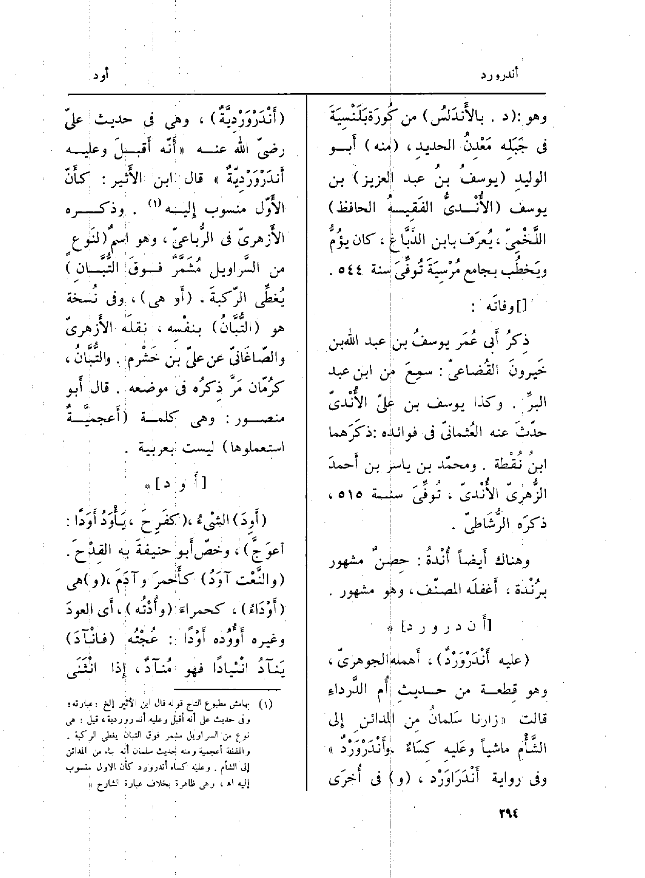 : (عَلَيْهِ {أَنْدَرْوَرْدٌ) ، أَهمله الجوهريّ، وَهُوَ قِطعة من حديثِ أُم الدَّرداءِ قَالَت: (زارنا سَلمانُ مِن المدائنِ إِلى الشَّأْم مَاشِيا وعَليهِ كِسَاءٌ،} وأَنْدَرْوَرْدٌ) وَفِي رِوَايَة {أَنْدَرَاوَرْد، (و) فِي أُخرَى (} أَنْدَرْوَرْدِيَّةٌ) ، وَهِي فِي حَدِيث عليّ رَضِيَ اللَّهُ عنهُ: (أَنّه أَقبلَ وَعَلِيهِ أَنْدَرْوَرْدِيَّةٌ) قَالَ ابْن الأَثير: كأَنّ الأَوّل مَنْسُوب إِليه. وَذكره الأَزهريّ فِي الرُّباعيّ، وَهُوَ اسمٌ (لنَوعٍ من السَّراويل مُشَمَّرٌ فوقَ التُّبَّانِ) يُغطِّي الرّكبةَ، (أَو هِيَ) ، وَفِي نُسخة هُوَ (التُّبَّانُ) بنفْسِه، نقلَه الأَزهريّ والصّاغَانيّ عَن عليّ بن خَشْرم. والتُّبَّانُ، كرُمّان مَرَّ ذِكرُه فِي مَوْضِعه. قَالَ أَبو مَنْصُور: وَهِي كلمة (أَعجميَّةٌ استعملوها) لَيست بعربية.