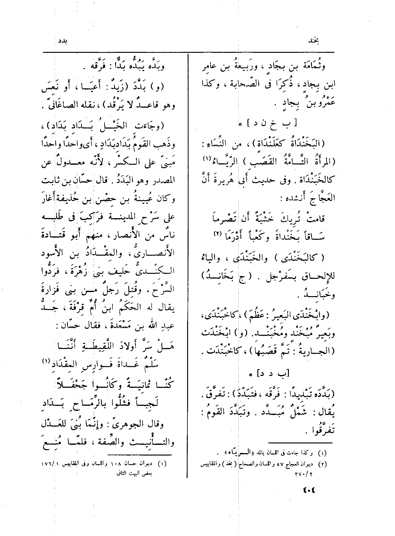 (وجَاءَتِ الخَيْلُ} بَدَادِ {بَدَادِ) ، وذَهب القَوْمِ بَدَادِ بَدَادِ، أَي وَاحِدًا وَاحِدًا مَبنيّ على الكسْر، لأَنّه معدولٌ عَن الْمصدر وَهُوَ البَدَدُ. قَالَ حسّان بن ثَابت وَكَانَ عُيينةُ بن حِصْن بن حُذيفة أَغارَ على سَرْحِ الْمَدِينَة فرَكِبَ فِي طَلبه ناسٌ من الأَنصار، مِنْهُم أَبو قَتادةَ الأَنصاريُّ، والمِقْدَادُ بن الأَسود الكِنْديُّ حَليف بني زُهْرَةَ،} فرَدُّوا السَّرْحَ، وقُتِلَ رَجلٌ من بني فَزارةَ يُقَال لَهُ الحَكَمُ ابنُ أُمِّ قِرْفَةَ، جَدُّ عبدِ الله بن مَسْعَدَةَ، فَقَالَ حسّان:
