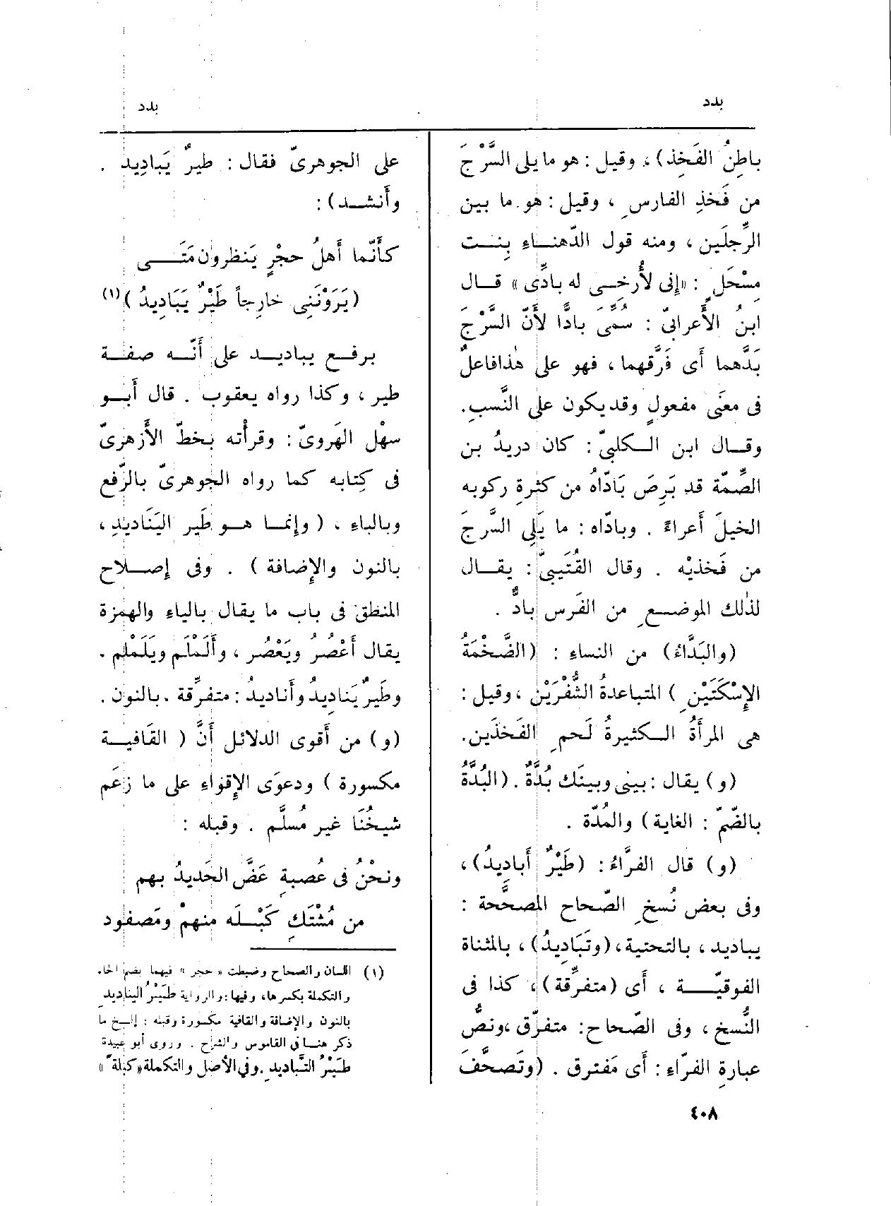 باطِنُ الفَخِذ) ، وَقيل: هُوَ مَا يَلِي السَّرْجَ من فَخذِ الفارسِ، وَقيل: هُوَ مَا بَين الرِّجلَين، ونه قَول الدّهناءِ بِنت مِسْحَلٍ: (إِني لأُرخِي لَهُ {- بادِّي) قَالَ ابنُ الأَعرابيّ: سُمِّيَ} بادًّا لأَنّ السَّرُجَ بَدَّهما أَي فَرَّقهما، فَهُوَ على هاذا فاعلٌ فِي معنَى مفعولٍ وَقد يكون على النَّسبِ. وَقَالَ ابْن الكلبيّ: كَانَ دريدُ بن الصِّمّة قد بَرِصَ بَادّاهُ من كثرةِ ركُوبه الخيلَ أَعراءً. وبادّاه: مَا يَلِي السَّرجَ من فَخذيْه. وَقَالَ القُتَيبيّ: يُقَال لذالك الموضعِ من الفَرس بادٌّ.