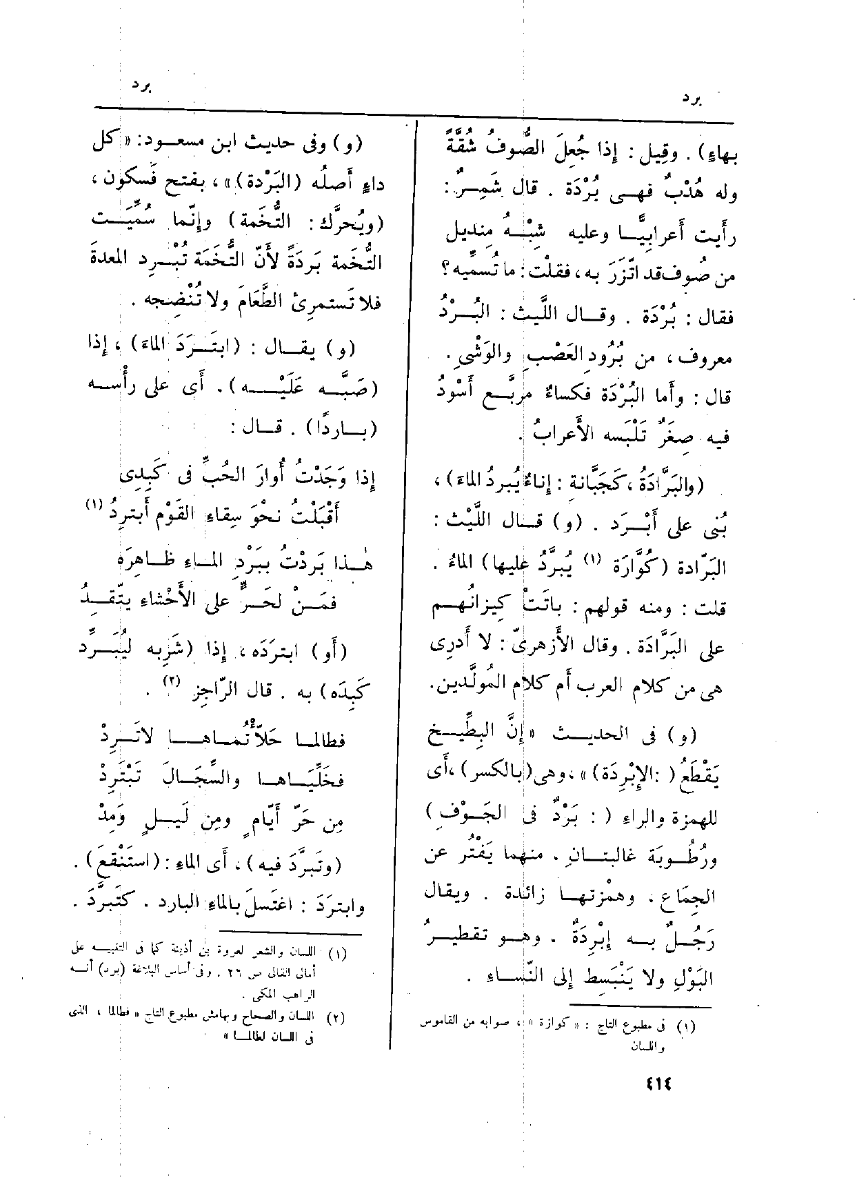 بهاءٍ) . وقِيل: إِذا جُعِلَ الصُّوفُ شُقَّةً وَله هُدْبٌ فَهِيَ بُرْدَة. قَالَ شَمِرٌ: رأَيت أَعرابِيًّا وَعَلِيهِ شِبْهُ مِنديل من صُوف قد اتّزَرَ بِهِ، فقلْت: مَا تُسمِّيه؟ فَقَالَ: بُرْدَة. وَقَالَ اللَّيث: البُرْدُ مَعْرُوف، من بُرُودِ العَصْبِ والوَشْيِ. قَالَ: وأَما البُرْدَة فكساءٌ مربَّع أَسْودُ فِيهِ صِغَرٌ تَلْبَسه الأَعرابُ.