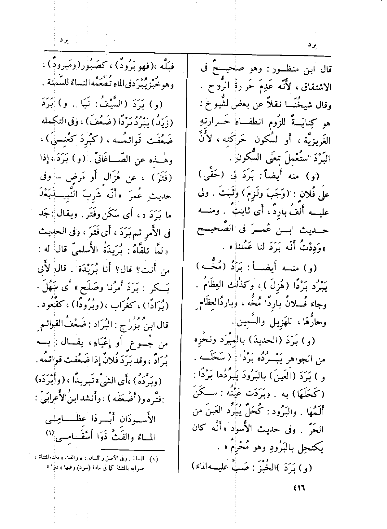 (و) بَرَدَ (السَّيْفِ: نَبَا. و) بَرَدَ (زَيْدٌ) يَبْرُدُ بَرْداً (ضَعُفَ) ، وَفِي (التكملة) ضَعُفَت قَوائمُه، (كبُرِدَ كعُنِيَ) ، وهاذِه عَن الصّاغَانيّ. (و) هُزَالٍ أَو مَرضٍ وَفِي حديثِ عُمرَ: (أَنّه شَرِبَ النَّبِيذَ بَعْدَ مَا بَرَدَ) ، أَي سَكَن وفَتَر. وَيُقَال: جَد فِي الأَمرِ ثمَّ بَرَدَ، أَي فَتَرَ، وَفِي الحَدِيث (لمَّا تلقَّاهُ: بُرَيدَةُ الأَسلميّ قَالَ لَهُ: من أَنت؟ قَالَ؟ أَنا بُرَيْدَة. قَالَ لأَبي بَكر: بَرَدَ أَمرُنا وصَلَح) أَي سَهُلَ (بُرَاداً) ، كغُرَاب، (وبُرُوداً) ، كقُعُود. قَالَ ابنُ بُزُرْج: البُرَاد: ضَعْفُ القوائمِ من جُوعٍ أَو إِعْيَاءٍ، يُقَال: بِهِ بُرَادٌ، وَقد بَرَدَ فُلانٌ إِذا ضَعُفت قوائمُه.