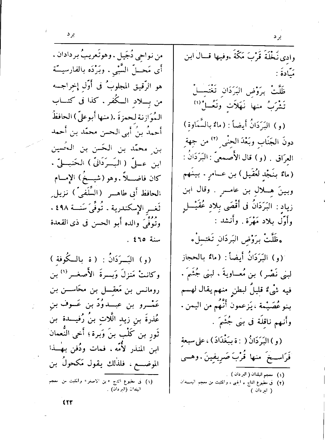 (و) البَرَدَانُ (: ة ببَغُدَاد) ، على سبعةِ فَرَاسخَ مِنْهَا قُرْبَ صَرِيفِينَ، وَهِي من نواحِي دُجَيل، وَهُوَ تَعريبُ بردادان، أَي مَحلّ السَّبْيِ، وبَرْدَه بالفارسيّة هُوَ الرّقيق المجلوبُ فِي أَوْلِ إِخراجه من بِلادِ الكُفر، كَذَا فِي كتاب المُوَازنة لِحمزةَ، (مِنْهَا أَبو عليّ) الحافظُ أَحمدُ بنُ أَبي الْحسن محمّد بن أَحمد بنِ محمّد بن الحَسن بن الحُسين بن عليّ (البَرَدَانيّ) الحَنبليّ، كَانَ فَاضلا، وَهُوَ (شيخُ) الإِمام الْحَافِظ أَبي طَاهِر (السِّلَفيّ) نزيلِ ثَغرِ الإِسكندرية، تُوفِّيَ سَنة 498، وتُوُفِّيَ وَالِده أَبو الْحسن فِي ذِي الْقعدَة سنة 465.