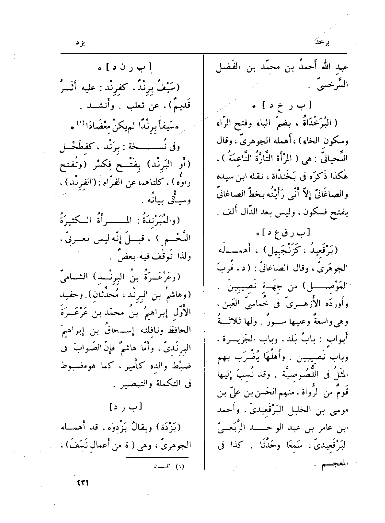 (وعَرْعَرَةُ بننُ البِرِنْدِ) الشاميّ (وهاشمُ بن البِرِنْد، مُحدِّثانِ) . وحفيد الأَوّلِ إِبراهيمُ بنُ محمّد بن عَرْعَرَةَ الْحَافِظ ونافِلته إِسحاقُ بن إِبراهيمَ البِرِنْدِيّ، وأَمّا هاشمٌ فإِنّ الصّوابَ فِي ضبْط والدِه كأَمير، كَمَا هُوَ مضبوط فِي (التكملة) و (التبصير) .