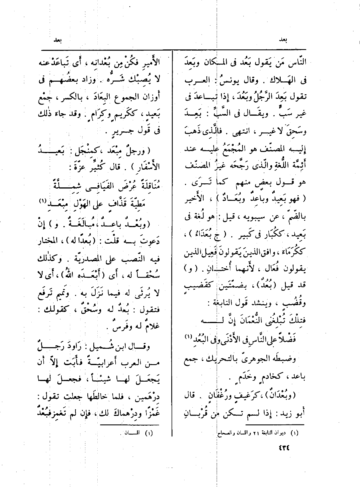 النّاس مَن يَقول بَعُد فِي الْمَكَان وبَعِدَ فِي الهَلاك. وَقَالَ يونسُ: الْعَرَب تَقول بَعِدَ الرَّجُلُ وبَعُدَ، إِذا تباعدَ فِي غير سَبَ. ويقَال فِي السَّبِّ: بعِدَ وسَحِقَ لَا غير، انْتهى. فالَّذِي ذَهبَ إِليه المصنّف هُوَ المُجْمَعُ عَلَيْهِ عِنْد أَئِمَّة اللُّغةِ والّذي رَجَّحَه غيرُ المصنّف هُوَ قَول بعضٍ مِنْهُم كَمَا تَرَى. (فَهُوَ بَعِيدٌ وباعِدٌ وبُعَادٌ) ، الأَخير بالضّمّ، عَن سِيبَوَيْهٍ، قيل: هُوَ لُغة فِي بَعِيد، ككُبَار فِي كَبير. (ج بُعَدَاءُ) ، ككُرَمَاءَ، وَافق الذينَ يَقولونَ فَعِيل الَّذين يَقُولُونَ فُعَال، لأَنهما أُختانِ. (و) قد قيل (بُعُدٌ) ، بضمّتَين كقَضيبٍ وقُضُبٍ، وينشد قَول النَّابِغَة: