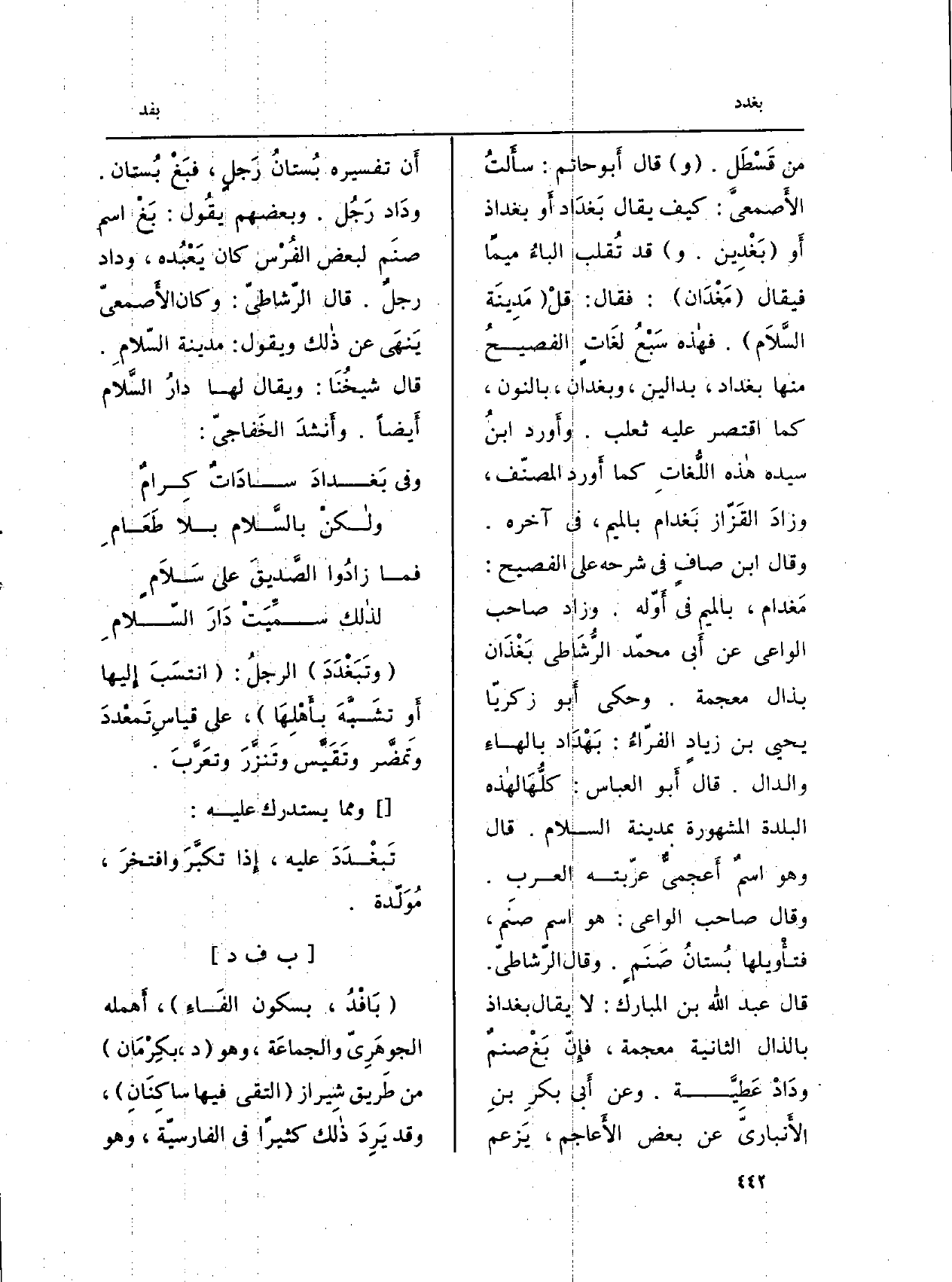 من قَسْطَل. (و) قَالَ أَبو حَاتِم: سأَلتُ الأَصمعيَّ: كَيفَ يُقَال بَغدَاد أَو بغداذ أَو (بَغْدِين. و) قد تُقلب الباءُ ميماً فَيُقَال (مَغْدَان) : فَقَالَ: قلْ (مَدِينَة السَّلاَم) . فهاذه سَبْعُ لغَاتٍ الفصيحُ مِنْهَا بَغْدَاد، بدالين، وبغدان، بالنُّون، كَمَا اقْتصر عَلَيْهِ ثَعْلَب. وأَورد ابنُ سَيّده هاذه اللُّغاتِ كَمَا أَورد المصنّف، وزادَ القَزّاز بَغدام بِالْمِيم، فِي آخِره. وَقَالَ ابْن صافٍ فِي شَرحه على الفصيح: مَغدام، بِالْمِيم فِي أَوّله. وَزَاد صَاحب الواعي عَن أَبي محمّد الرُّشَاطي بَغْذَان بذال مُعْجمَة. وَحكى أَبو زكريّا يحيي بن زيادٍ الفرّاءُ: بَهْدَاد بالهاءِ وَالدَّال. قَالَ أَبو الْعَبَّاس: كلُّهَا لهاذه الْبَلدة الْمَشْهُورَة بِمَدِينَة السَّلَام. قَالَ وَهُوَ اسمٌ أَعجميٌّ عرّبته العربِ. وَقَالَ صَاحب الواعي: هُوَ اسْم صنَم، فتأْويلها بُستانُ صَنَمٍ. وَقَالَ الرّشاطيّ. قَالَ عبد الله بن الْمُبَارك: لَا يُقَال بغداذ بِالذَّالِ الثَّانِيَة مُعْجمَة، فإِنّ بَغْ صنمٌ ودَادْ عَطِيَّة. وَعَن أَبي بكرِ بنِ الأَنباريّ عَن بعض الأَعاجم، يَزعم أَن تَفْسِيره بُستانُ رَجلٍ، فبَغْ بُستان. ودَاد رَجُل. وَبَعْضهمْ يقُول: بَغْ اسْم صنَم لبَعض الفُرْس كَانَ يَعْبُده، وداد رجلٌ. قَالَ الرّشاطيّ: وَكَانَ الأَصمعيّ يَنهَى عَن ذالك وَيَقُول: مَدِينَة السّلامِ. قَالَ شيخُنَا: وَيُقَال لَهَا دارُ السَّلام أَيضاً. وأَنشدَ الخَفاجيّ: