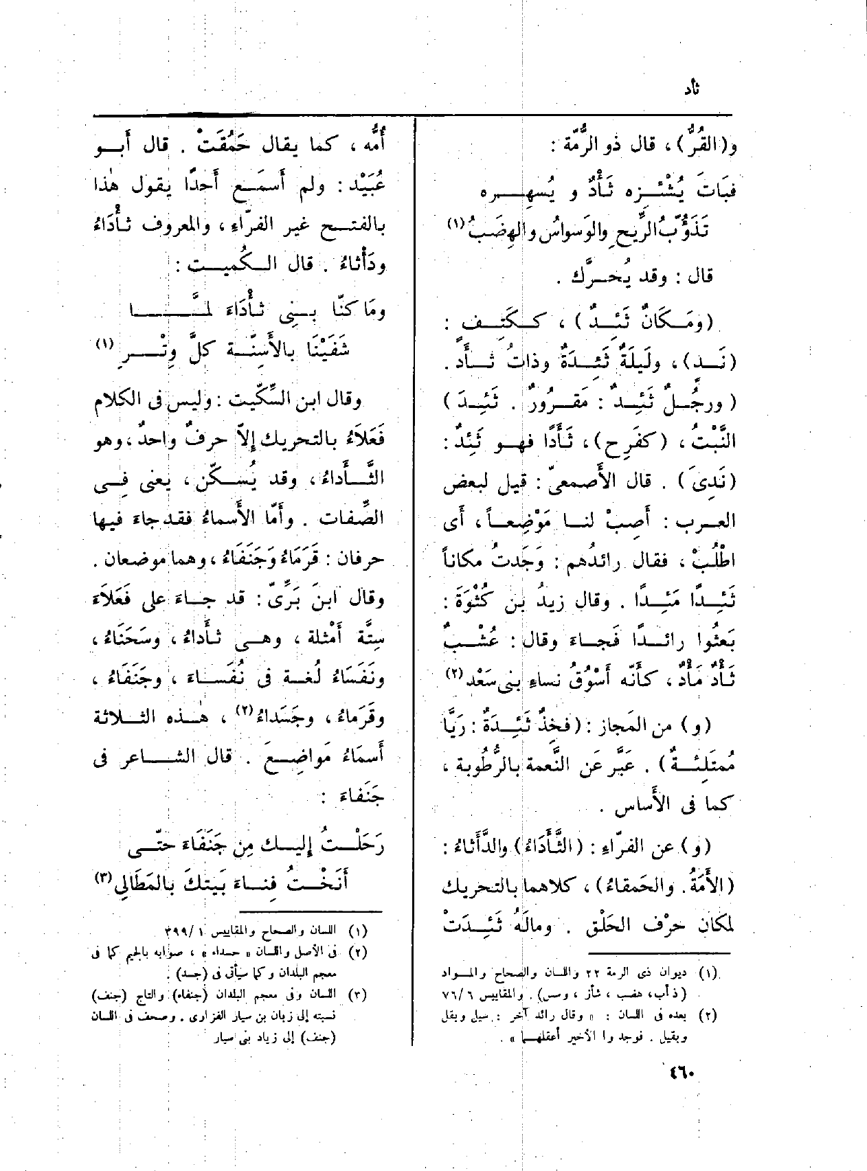 وَقَالَ ابْن السِّكّيت: وَلَيْسَ فِي الْكَلَام فَعَلاَءُ بالتحربك إِلاّ حرفٌ واحدٌ، وَهُوَ الثَّأَداءُ، وَقد يُسكّن، يَعْنِي فِي الصِّفات. وأَمّا الأَسماءُ فقد جاءَ فِيهَا حرفان: قَرَمَاءُ وَجَنَفَاءُ، وهما موضعان. وَقَالَ ابنَ بَرِّيّ: قد جاءَ على فَعَلاَءَ سِتَّة أَمْثلة، وَهِي ثأَداءُ، وسَحَنَاءُ، ونَفَسَاءُ لُغة فِي نُفَساءَ، وجَنَفَاءُ، وقَرَماءُ، وجَسَداءُ، هاذه الثَّلَاثَة أَسمَاءُ مَواضِعَ. قَالَ الشَّاعِر فِي جَنَفاءَ: