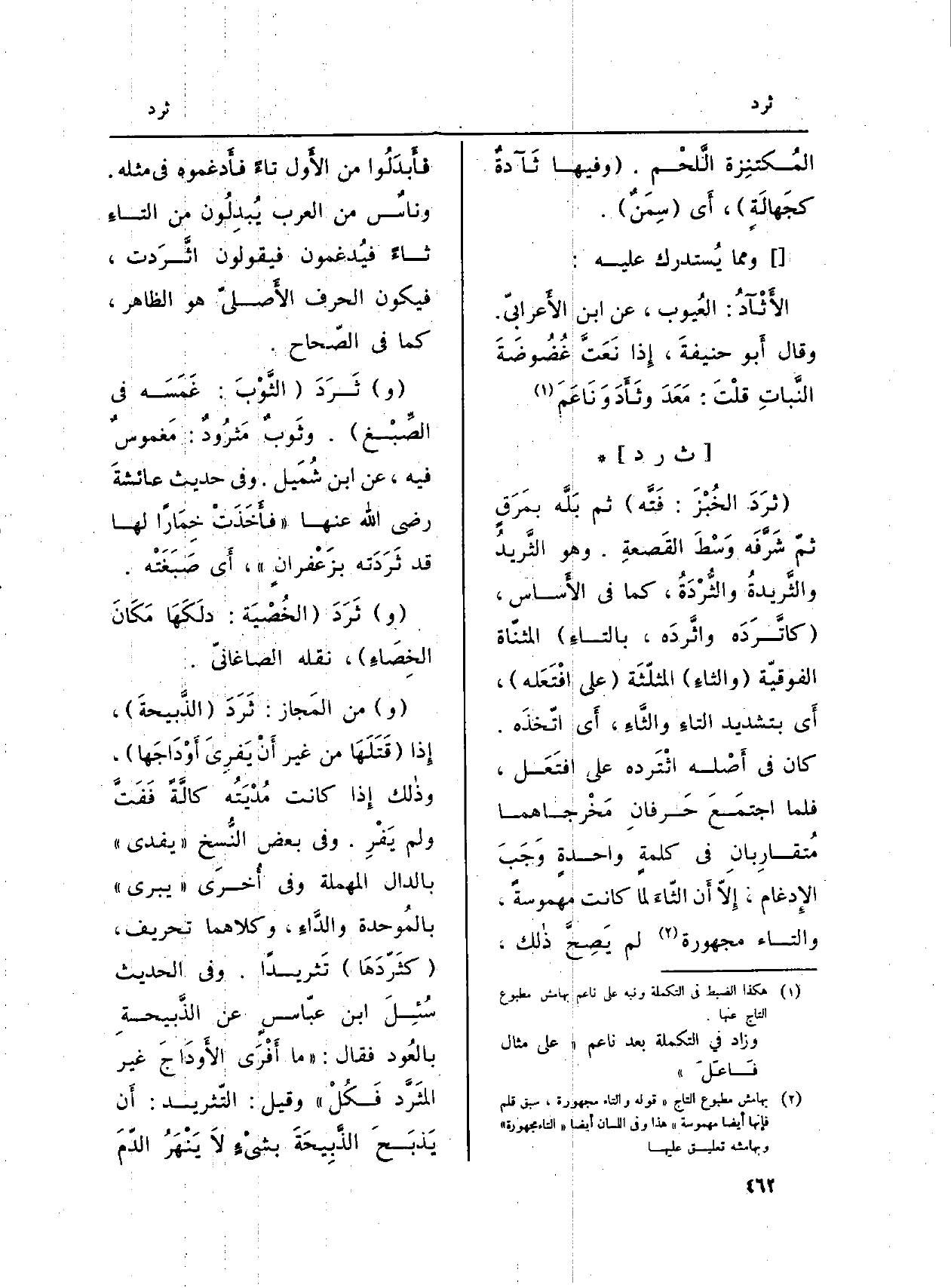 : (ثرَدَ الخُبْزَ: فَتَّه) ثمَّ بَلَّه بمَرَقٍ ثمّ شَرَّفَه وَسْطَ القَصعةِ. وَهُوَ الثَّريدُ والثَّريدةُ والثُّرْدَةُ، كَمَا فِي (الأَساس) ، (كاتَّرَدَه واثَّردَه، بالتاءِ) المثنّاة الفوقيّة (والثاءِ) المثلّثَة (على افْتَعَله) ، أَي بتَشْديد التاءِ والثَّاءِ، أَي اتّخذَه. كَانَ فِي أَصْله اثْتَرده على افتَعَل، فَلَمَّا اجتمَعَ حَرفانِ مَخْرجاهما مُتقارِبانِ فِي كلمةٍ واحدةٍ وَجَبَ الإِدغام، إِلاّ أَن الثّاءَ لما كَانَت مهموسةً، وَالتَّاء مجهورة لم يَصِحَّ ذالك، فأَبدَلُوا من الأَول تَاء فأَدغموه فِي مثله. وناسٌ من الْعَرَب يُبدِلُون من التاءِ ثاءً فيُدغمون فَيَقُولُونَ اثَّرَدت، فَيكون الْحَرْف الأَصليّ هُوَ الظَّاهِر، كَمَا فِي (الصّحاح) .