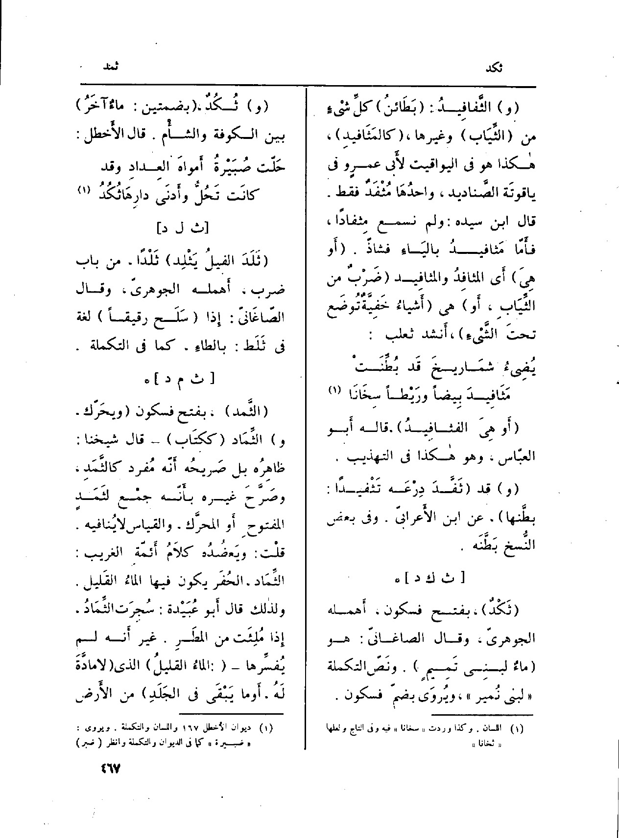 : (الثَّمد) ، بِفَتْح فَسُكُون (ويحَرّك، و) الثِّمَاد (ككتَاب) قَالَ شَيخنَا: ظاهِرُه بل صَريحُه أَنّه مُفرد كالثَّمَدِ، وصَرَّحَ غَيره بأَنّه جمْع لثَمَدٍ المفتوحِ أَو المحرَّك، وَالْقِيَاس لَا يُنافيه. قلْت: ويَعضُدُه كلاَمُ أَئمّةِ الْغَرِيب: الثِّمَاد، الحُفَر يكون فِيهَا الماءُ القَليل. ولذالك قَالَ أَبو عُبَيْدة: سُجِرَت الثِّمَادُ، إِذا مُلِئَت من المطَرِ. غير أَنه لم يُفسَّرها (: الماءُ القليلُ) الَّذِي (لَا مادَّةَ لَهُ، أَو مَا يَبْقَى فِي الجَلَدِ) من الأَرض