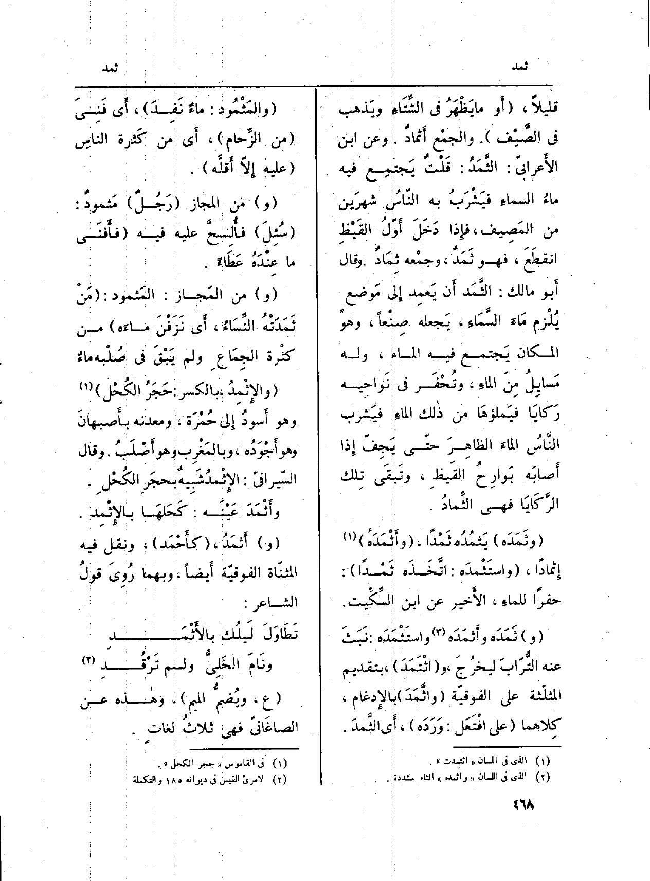 قَلِيلا، (أَو مَا يَظْهَرُ فِي الشِّتَاءِ ويَذهب فِي الصَّيْف) . والجمْع أَثمادٌ. وَعَن ابْن الأَعرابيّ: الثَّمَدُ: قَلْتٌ يَجتمِع فِيهِ ماءُ السماءِ فيَشْرَبُ بِهِ النّاسُ شهرَين من المَصِيف، فإِذا دَخَلَ أَوّلُ القَيْظِ انقطَعَ، فَهُوَ ثَمَدٌ، وجمْعه ثِمَادٌ. وَقَالَ أَبو مَالك: الثَّمَد أَن يَعمِد إِلى مَوضع يُلْزم مَاءَ السَّمَاءِ، يَجهله صِنْعاً، وَهُوَ الْمَكَان يَجتمع فِيهِ المَاء، وَله مَسايِلُ مِنَ الماءِ، وتُحْفَر فِي نَواحِيه رَكايَا فيَملؤهَا من ذالك الماءِ فيَشرب النَّاسُ الماءَ الظاهِرَ حتّى يَجِفّ إِذا أَصابَه بَوارِحُ القَيظِ، وتَبقَى تِلك الرَّكَايَا فَهِيَ الثِّمادُ.