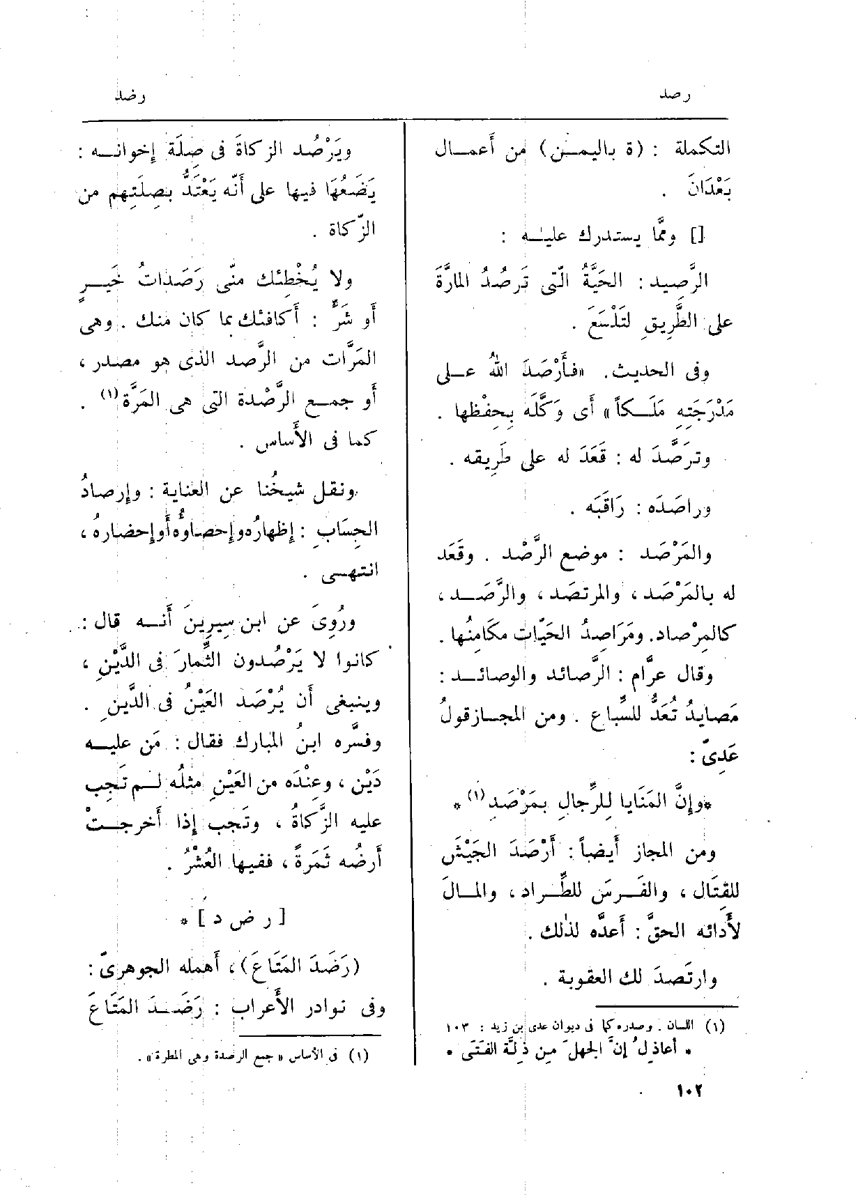 وَقَالَ عرَّام: الرَّصائد والوصائد: مَصايدُ تُعَدُّ للسِّباع. وَمن الْمجَاز قولُ عَدِيّ: