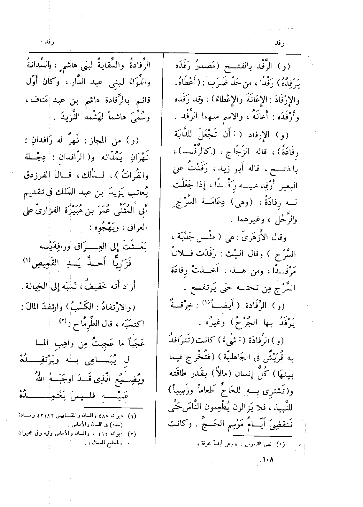 (و) من الْمجَاز: نَهرٌ لَهُ رَافدانِ نَهْرَانِ يَمُدّانه و (الرّافدانِ: دِجْلة والفُراتُ) ، لذالك، قَالَ الفرزدق يُعاتب يَزيدَ بن عبد المَلك فِي تَقْدِيم أَبي المُثَنَّى عُمَرَ بن هُبَيْرَة الفزاريّ على الْعرَاق، ويَهْجُوه: