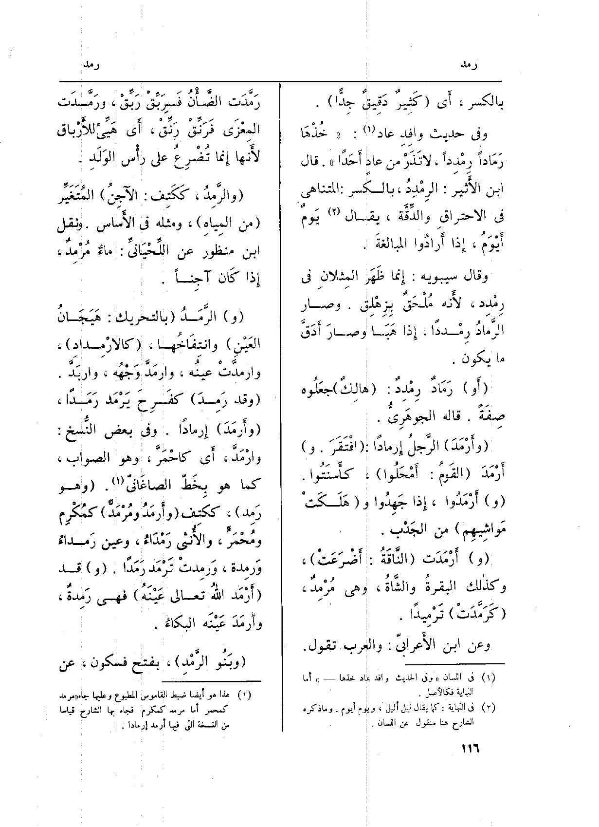 (و) الرَّمَدُ (بِالتَّحْرِيكِ: هَيَجَانُ العَيْنِ) وانتفَاخُها، (كالارْمِدادِ) ، وارمدَّتْ عينُه، وارمَدَّ وَجْهُه، واربَدَّ. (وَقد رَمِدَ) كفَرِحَ يَرْمَد رَمَداً، (وأَرمَدَ) إِرماداً. وَفِي بعض النُّسخ: وارْمَدَّ، أَي كالحْمَرَّ، وَهُوَ الصَّوَاب، مَا هُوَ بِخَطّ الصاغَانيّ. (وَهُوَ رَمِد) ، ككتِف (وأَرمَدُ ومُرْمَدٌّ) كمُكْرِم ومُحْمَرَ، والأُنثى رَمْدَاءُ، وَعين رَمداءُ وَرمِدة، وَرمِدتْ تَرْمَد رَمَداً. (و) قد (أَرْمَد اللهُ تَعَالَى عَيْنَهُ) فِي رَمِدةٌ، وأَرمَدَ عَيْنَه البكاءُ.