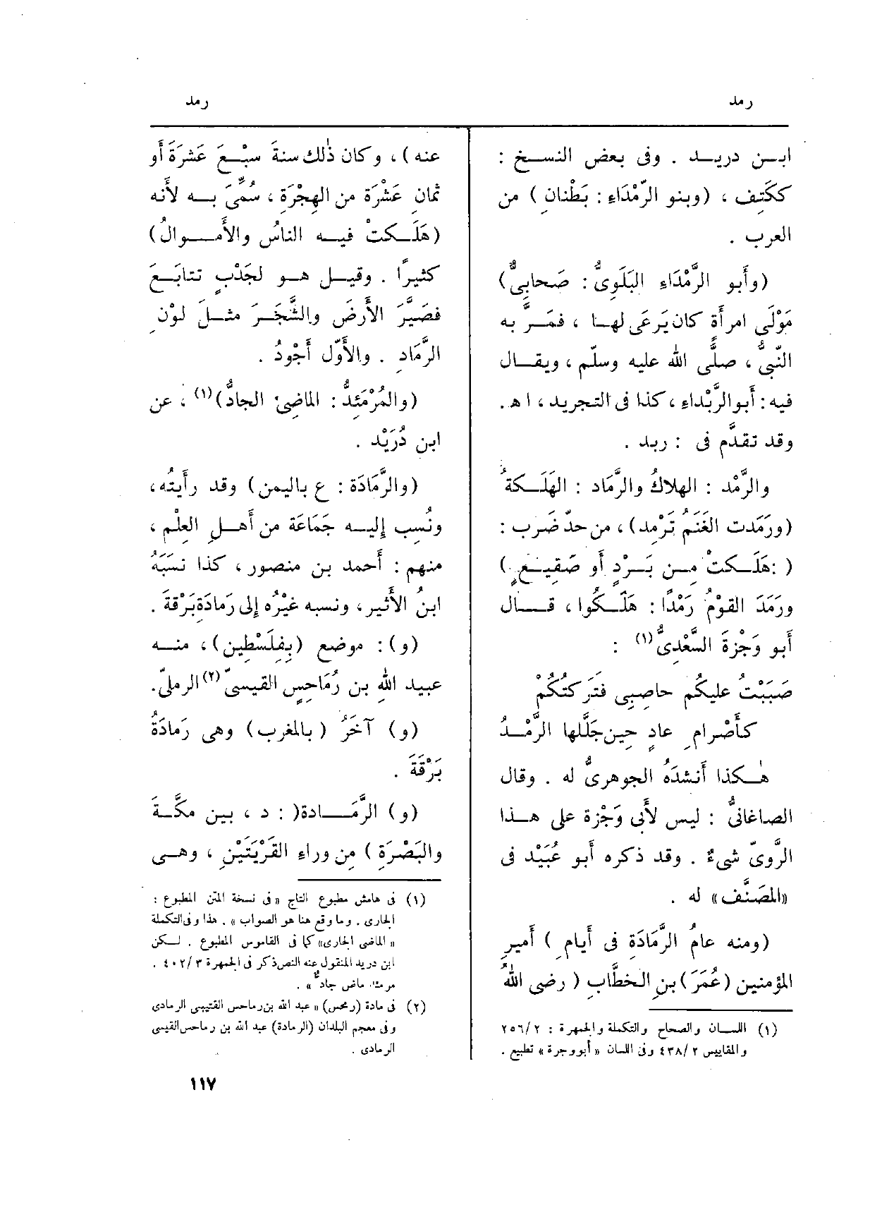 (والرَّمَادَة: ع بِالْيمن) وَقد رأيتُه، ونُسِب إِليه جَمَاعَة من أَهلِ العِلْم، مِنْهُم: أَحمد بن مَنْصُور، كَذَا نسَبَهُ ابنُ الأَثير، وَنسبه غيْرُه إِلى رَمادَةِ بَرْقةَ.