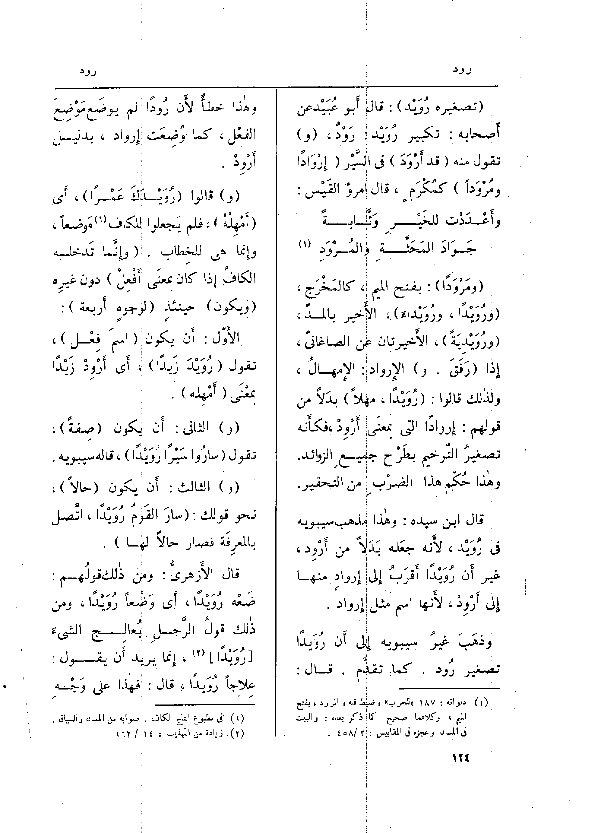 وذهَبَ غيرُ سِيبَوَيْهٍ إِلى أَن رُوَيداً تَصْغِير {رُود. كَمَا تقدَّم. قَالَ: وهاذا خطأٌ لأَن رُوداً لم يوضَع مَوْضِعَ الفعْل، كَمَا وُضِعَت} إِرواد، بِدَلِيل {أَرْوِدْ.