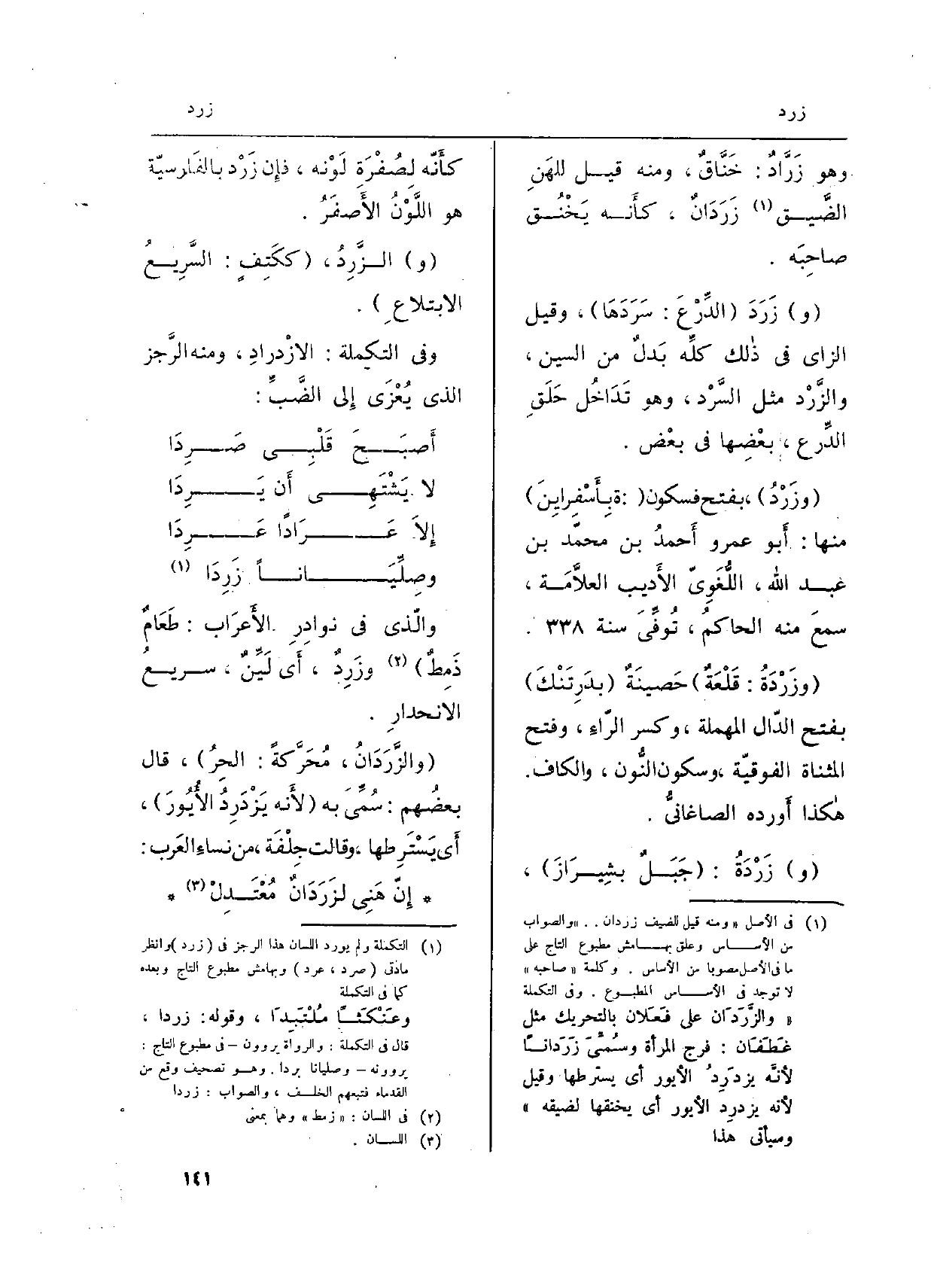(وزَرْدُ) ، بِفَتْح فَسُكُون:) ، ة بِأَسْفِراينَ) مِنْهَا: أَبو عَمْرو أَحمدُ بن محمّد بن عبد الله، اللُّغَوِيّ الأَديب العلَّامَة، سمعَ مِنْهُ الحاكمُ، تُوفِّيَ سنة 338 هـ.