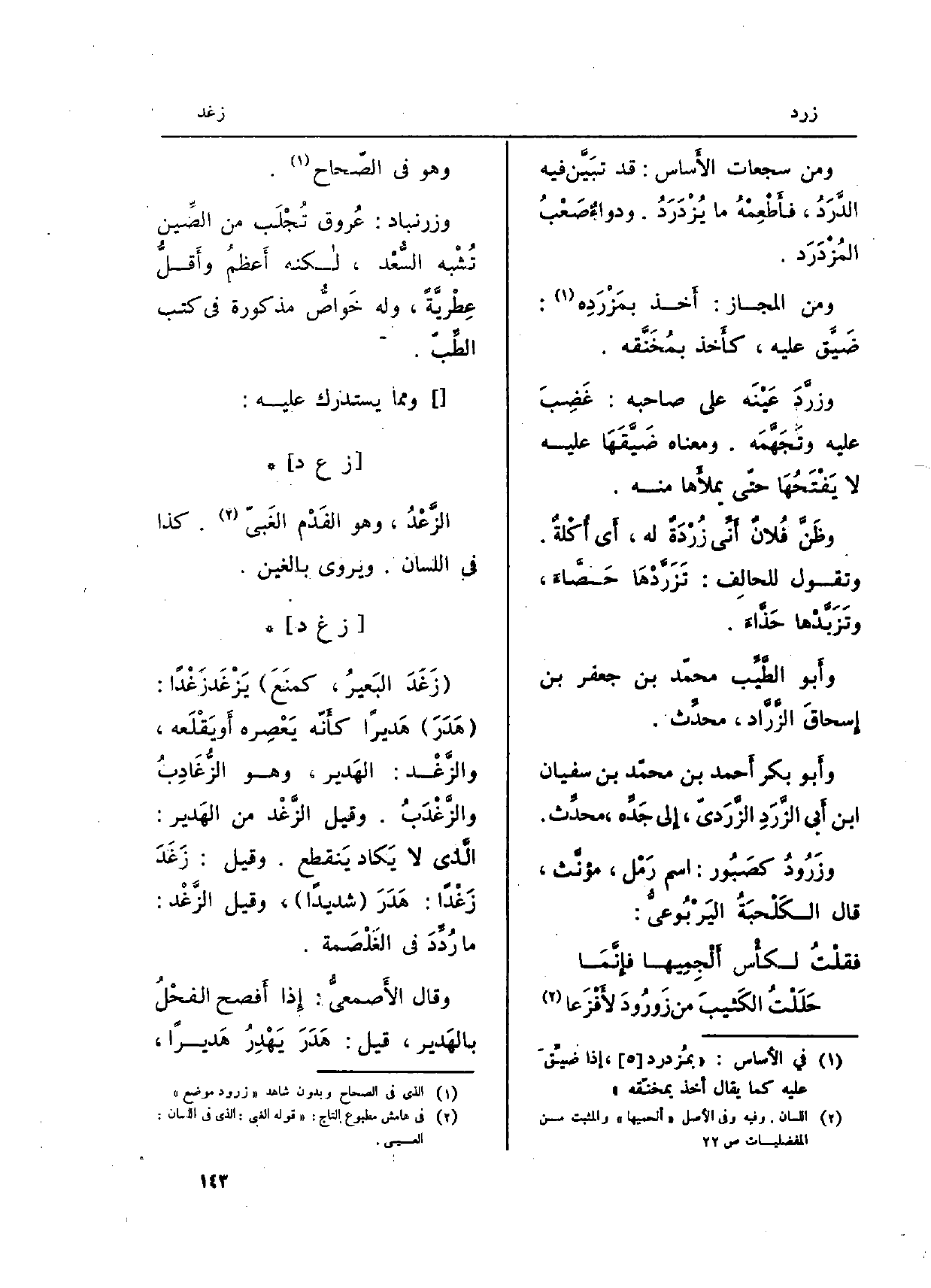 وزرنباد: عُروق تُجْلَب من الصِّين تُشْبه السّعْد، لاكنه أَعظمُ وأَقلُّ عِطْريَّةً، وَله خَواصُّ مَذْكُورَة فِي كتب لطِّبّ.