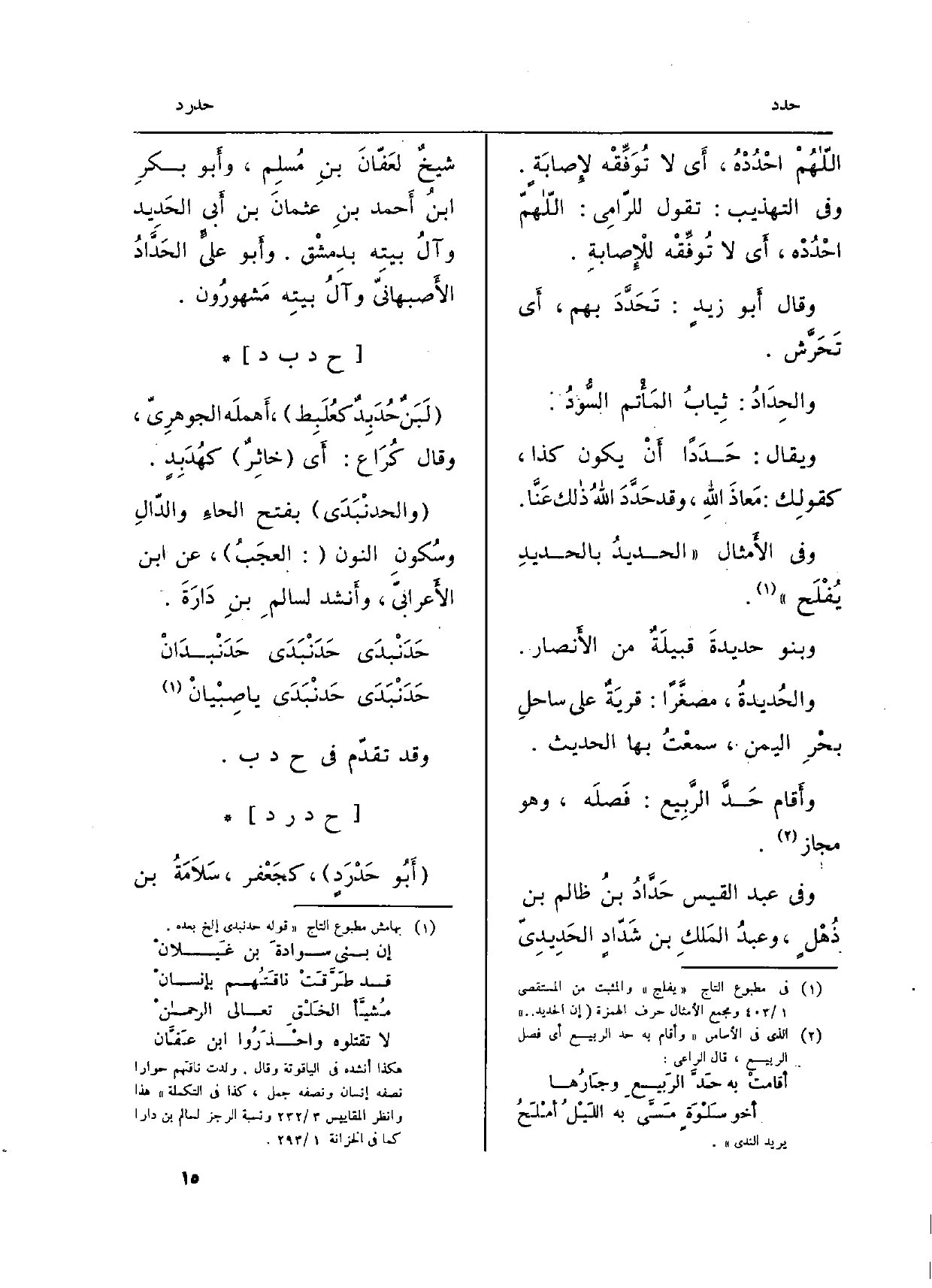 وَفِي عبد الْقَيْس حَدَّادُ بنُ ظَالِم بن ذُهْلٍ، وعبدُ المَلكِ بن شَدّادٍ} - الحَدِيدِيّ شيخٌ لعَفّانَ بنِ مُسلِم، وأَبو بكرِ بنُ أَحمد بنِ عثمانَ بن أَبي الحَدِيد وآلُ بيتِه بدِمشْق. وأَبو عليَ الحَدَّادُ الأَصبهانيّ وآلُ بيتِه مَشهورُون.
