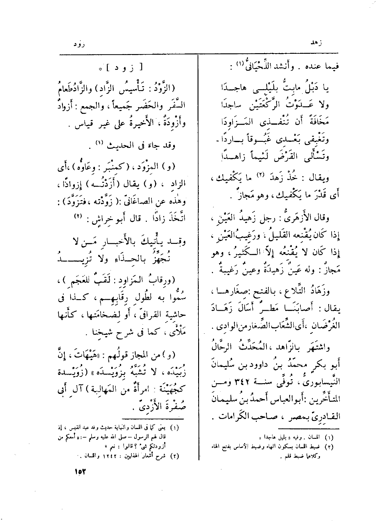 : ( {الزَّوْدُ: تَأْسيسُ} الزَّادِ) {والزَّادُ طَعامُ السَّفَر والحَضَر جَميعاً، وَالْجمع:} أَزوادٌ {وأَزْوِدَةٌ، الأَخيرةُ على غير قِيَاس.