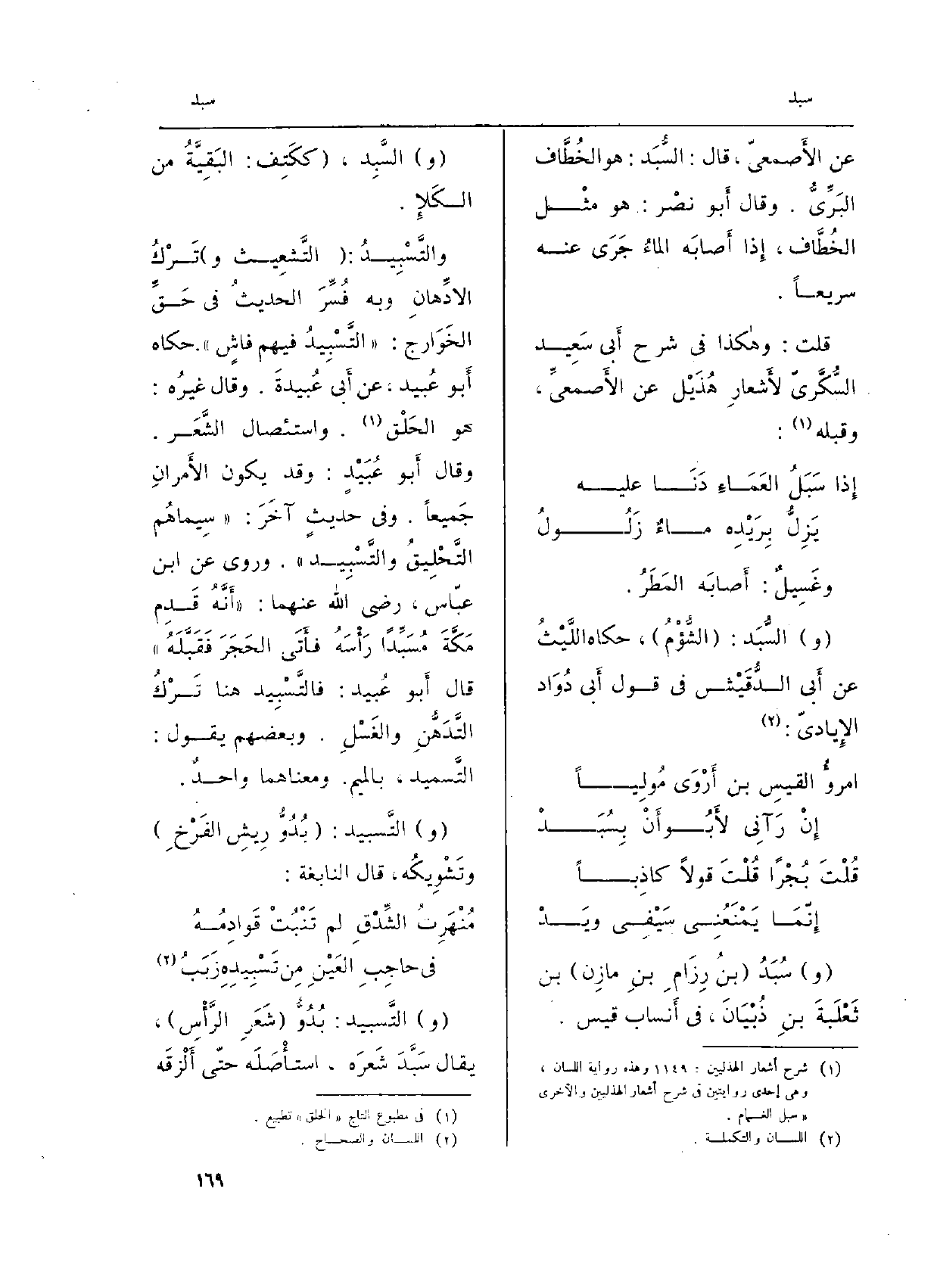والتَّسْيدُ: (التَّشعِيث و) تَرْكُ الأَدِّهانِ وَبِه فُسِّرَ الحديثُ فِي حَقِّ الخَوَارج: (التَّسْبِيدُ فيهم فاشٍ) حَكَاهُ أَبو عُبيد، عَن أَبي عُبيدةَ. وَقَالَ غيرُه: هُوَ الحَلْق. واستئصال الشَّعَر. وَقَالَ أَبو عُبَيْدٍ: وَقد يكون الأَمرانِ جَميعاً. وَفِي حديثٍ آخَرَ: (سِيمهُم التَّحْلِيقُ والتَّسْبِيد) . وروى عَن ابْن عبّاس، رَضِي الله عَنْهُمَا: (أَنَّهُ قَدِم مَكَّةَ مُسَبِّداً رَأْسَهُ فأَتَى الحَجَرَ فَقَبَّلَهُ) قَالَ أَبو عُبيد: فالتَّسْبِيد هُنَا تَرْكُ التَّدَهُّنِ والغَسْلِ. وَبَعْضهمْ يَقُول: التَّمسيد، بِالْمِيم. ومعناهما واحدٌ.