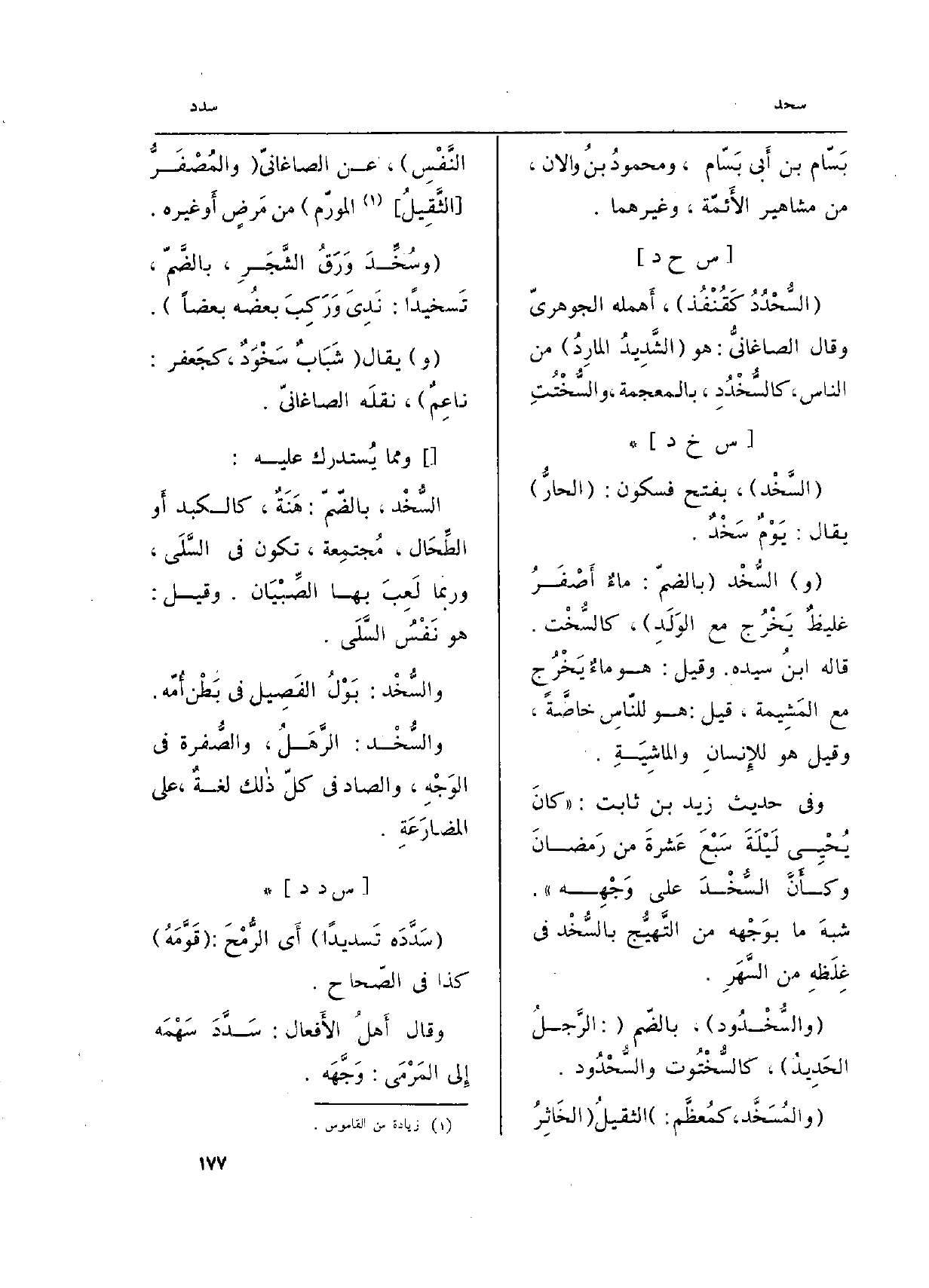 وَفِي حَدِيث زيد بن ثَابت: (كانَ يُحْيِي لَيْلَةَ سَبْعَ عَشرةَ من رَمضانَ وكأَنَّ السُّخْدَ على وَجْهِهِ) . شبهَ مَا بوَجْهه من التَّهيُّج بالسُّخْد فِي غِلَظهِ من السَّهَرِ.