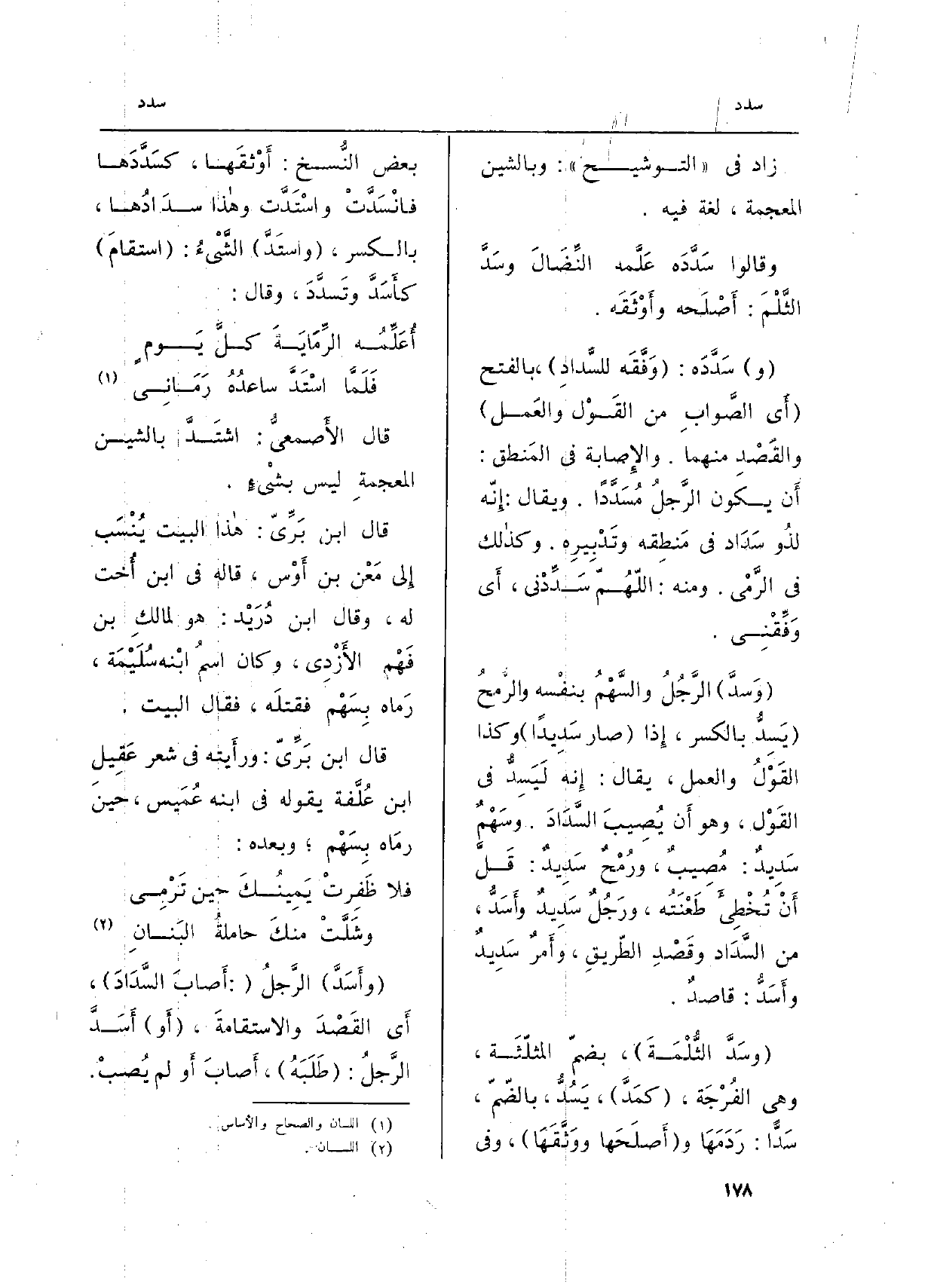 وَقَالُوا سَدَّدَه عَلَّمه النِّضَالَ {وسَدَّ الثَّلْمَ: أَصْلَحه وأَوْثَقَه.