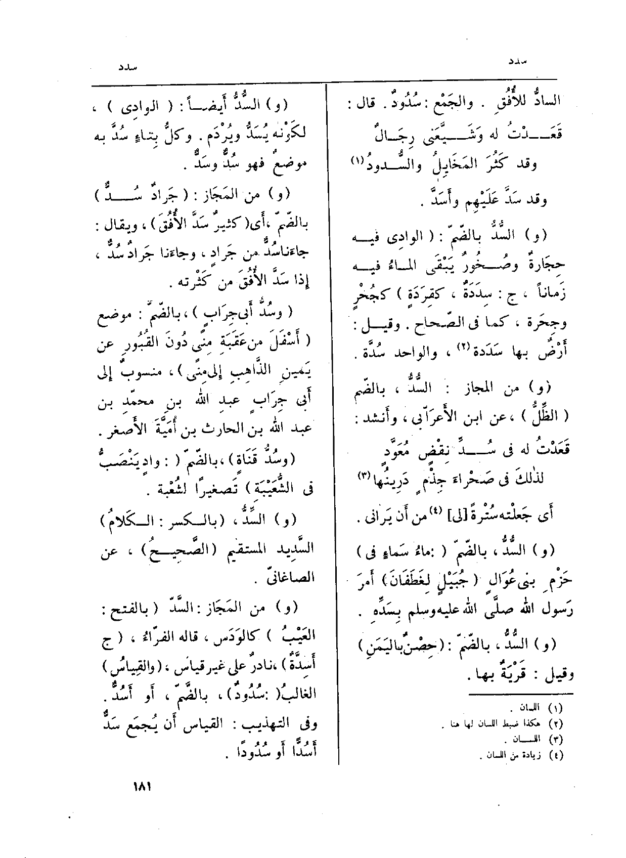 (و) من المَجَاز: السَّدّ (بِالْفَتْح: العَيْبُ) كالوَدَس، قَالَه الفرّاءُ. (ج {أَسِدَّةٌ) ، نادرٌ على غير قِيَاس، (والقِياسُ) الغالبُ: (} سُدُودٌ) ، بالضَّمّ، أَو {أَسُدٌّ. وَفِي التَّهْذِيب: الْقيَاس أَن يُجمَع سَدٌّ} أَسُدًّا أَو! سُدُوداً.