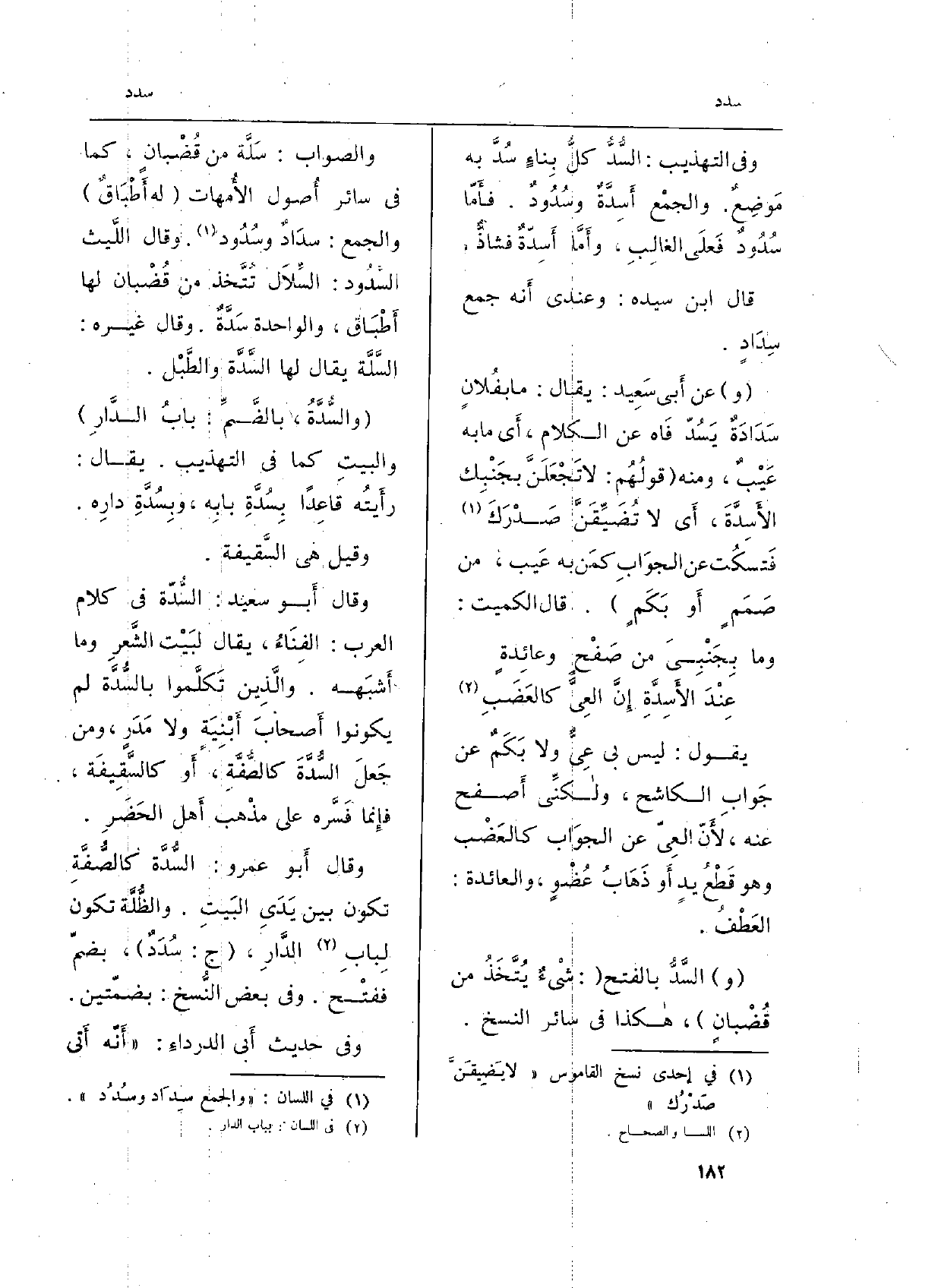 وَفِي التَّهْذِيب: السُّدُّ كلُّ بِناءٍ سُدَّ بِهِ مَوضِعٌ. والجمْع {أَسِدَّةٌ} وسُدُودٌ. فأَمّا {سُدُودٌ فَعلَى الغالِبِ، وأَمَّا} أَسِدّةٌ فشاذٌّ.