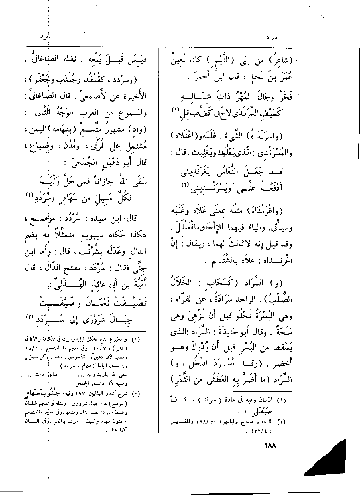 قَالَ ابْن سَيّده: سُرْدُد: مَوضِع، هاكذا حَكاه سيبويهِ متمثِّلاً بِهِ بِضَم الدالِ وعَدَلَه بِشُرْنُب، قَالَ: وأَما ابْن جِنِّي فَقَالَ: سُرْدَد، بِفَتْح الدّال، قَالَ أُمَيَّةُ بن أَبي عائِذٍ الهُذَلِيّ: