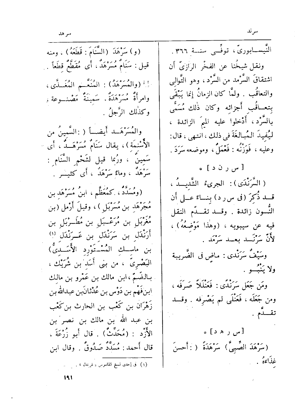 (والمُسَرْهَدُ) : المُنَعَّم المُغَذَّى، وامرأَةٌ مُسَرْهَدَةٌ، سَمِينَةٌ مَصْنعة، وكذالك الرَّجلُ.