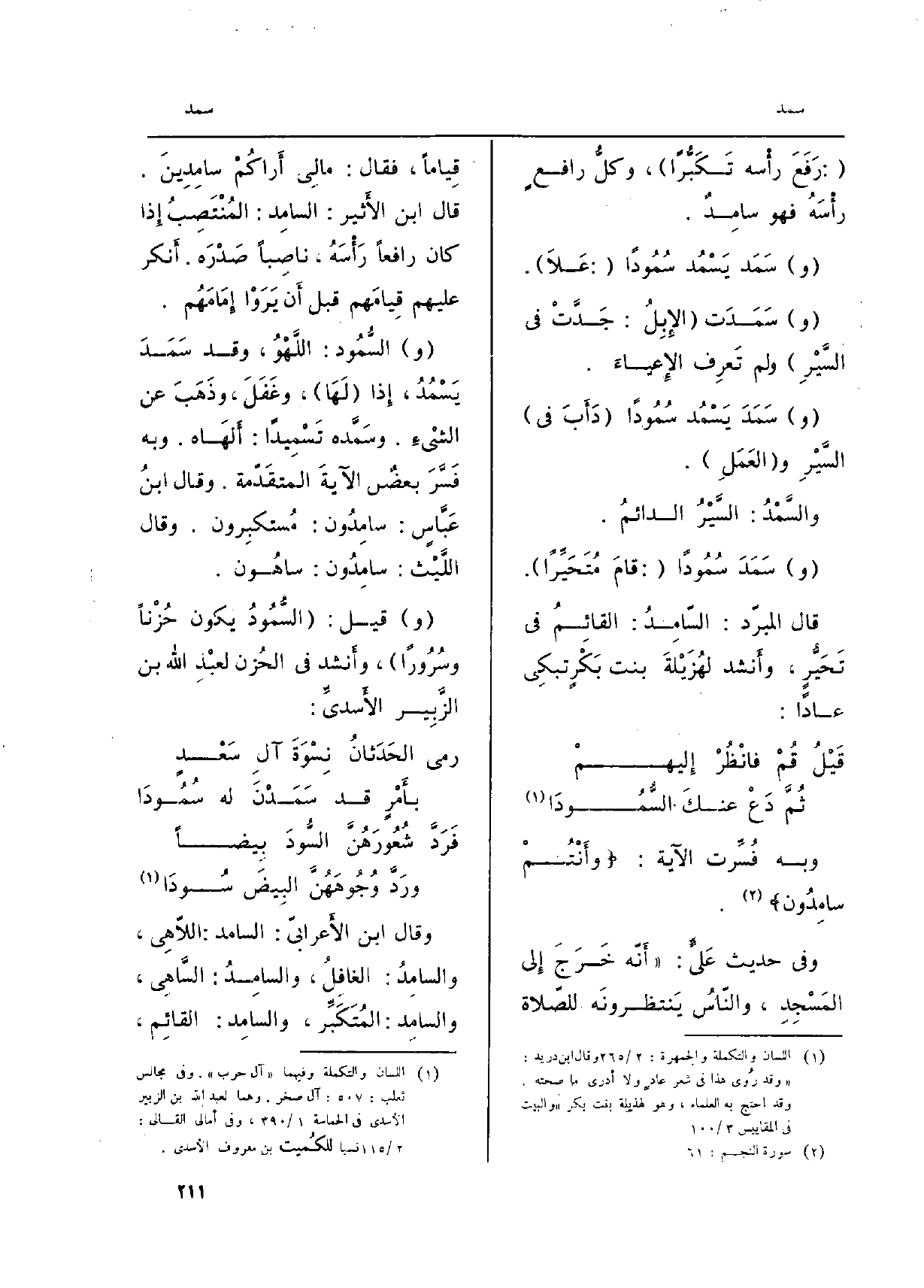 (و) السُّمُود: اللَّهْوُ، وَقد سَمَدَ يَسْمُدُ، إِذا (لَهَ) ، وغَفَلَ، وذَهَبَ عَن الشيْءِ. وسَمَّده تَسْمِيداً: أَلهَاه. وَبِه فَسَّرَ بعضٌ الآيةَ المتقَدّمة. وَقَالَ ابنُ عَبَّاسٍ: سامِدُون: مُستكبِرون. وَقَالَ اللَّيْث: سامِدُون: ساهُون.
