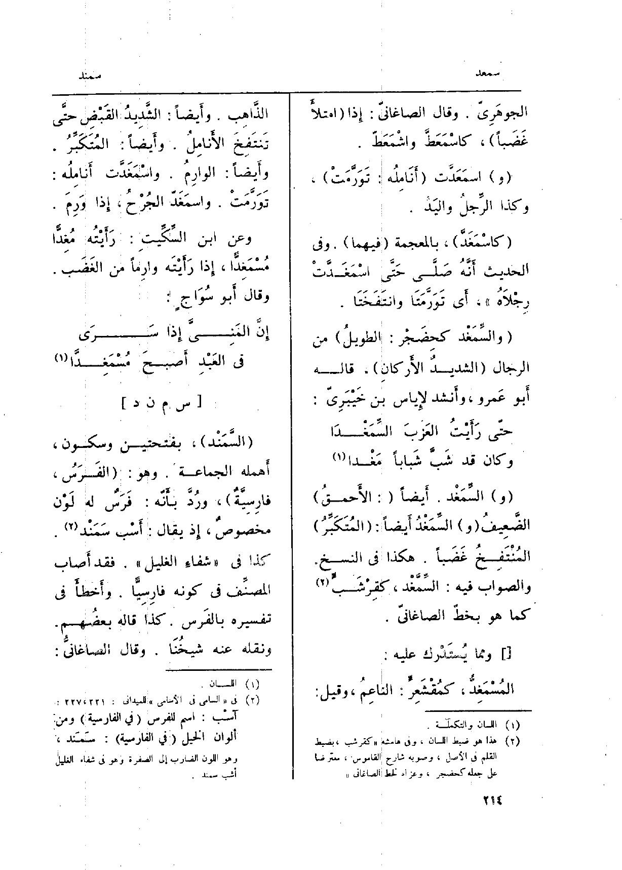 (و) السِّمَغْد. أَيضاً: (الأَحمقُ) الضَّعِيفُ (و) السِّمَغْدُ أَيضاً: (المُتَكَبِّرُ) المُنْتَفِخُ غَضَباً. هَكَذَا فِي النّسخ. وَالصَّوَاب فِيهِ: السِّمَّغْد، كقِرْشَبَ كَمَا هُوَ بخطّ الصاغانيّ.