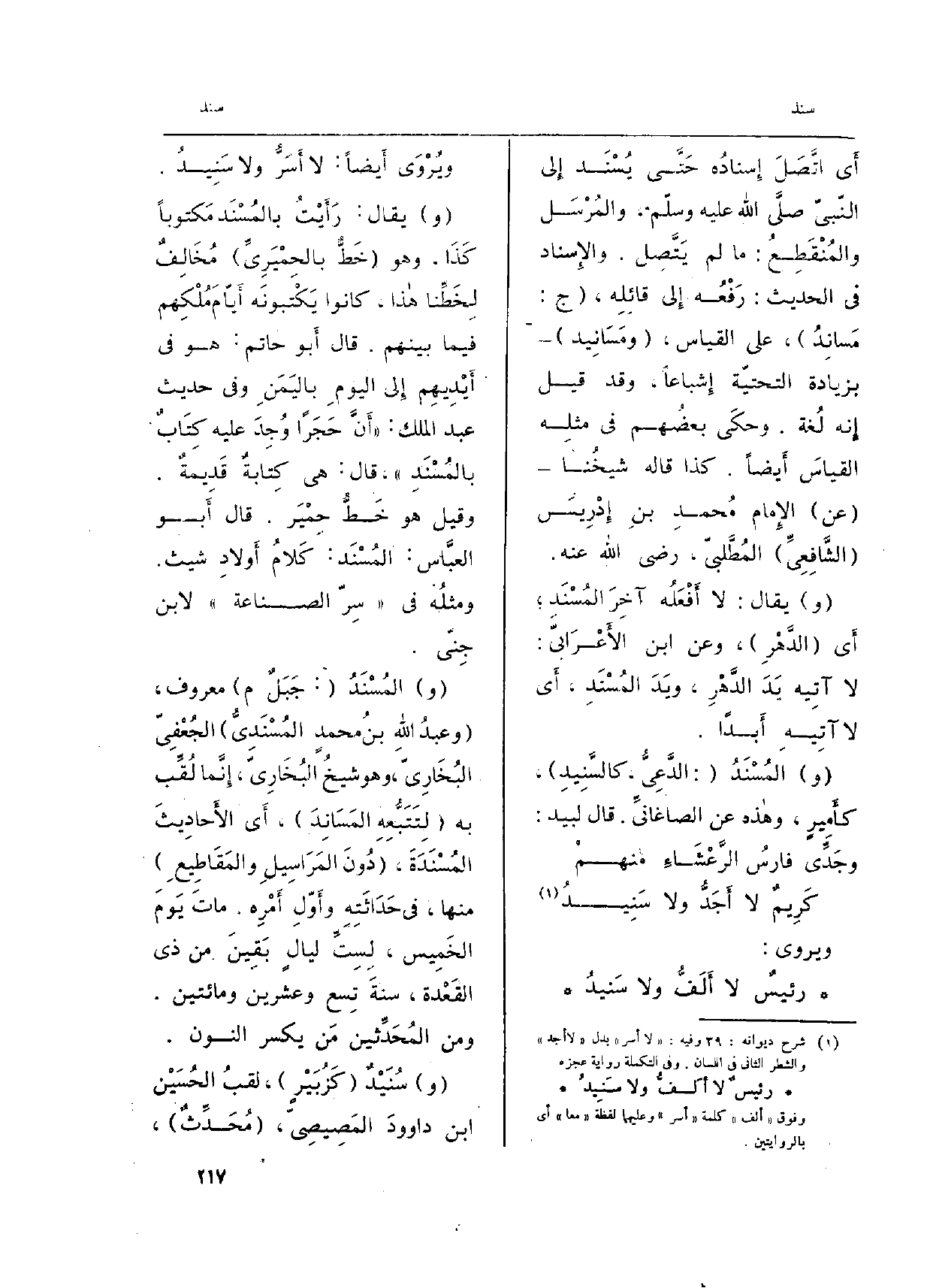 (و) المُسْنَدُ: (الدَّعِيُّ، كالسَّنِيدِ) ، كأَمِيرٍ، وهاذه عَن الصاغانيِّ. قَالَ لبيد: